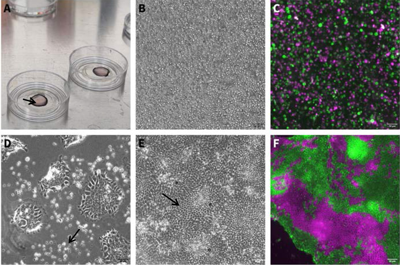Figure 1. Culture morphology during single-cell monolayer formation. (A) Medium containing single-cell suspension on a PAA gel (gel appears as a circle, arrow pointing to the gel rim), after plating (step B2). (B) Brightfield image of single-cell suspension after initial incubation time (step B3). Scale bar: 50 μm. (C) Fluorescent image of single-cell suspension generated from a mix of two different organoid lines at the end of the initial incubation time (step B3). Scale bar: 50 μm. (D) Cell attachment following 48 h in ENR-CNY medium (step B6). Dead cells appear as white, round clumps (arrow). Attached cells are flat and mesenchymal-looking due to the use of the plating medium, which facilitates cell spreading. Scale bar: 50 μm. (E) Brightfield image of mature monolayer, 10 days after initial seeding. Some crypt regions are marked with an asterisk. Note the hexagonal shape in the villus-like regions (arrow). Scale bar: 50 μm. (F) Fluorescent image of a mature monolayer from mixed organoids (seen in C1), expressing tdTomato or GFP. Scale bar: 50 μm.