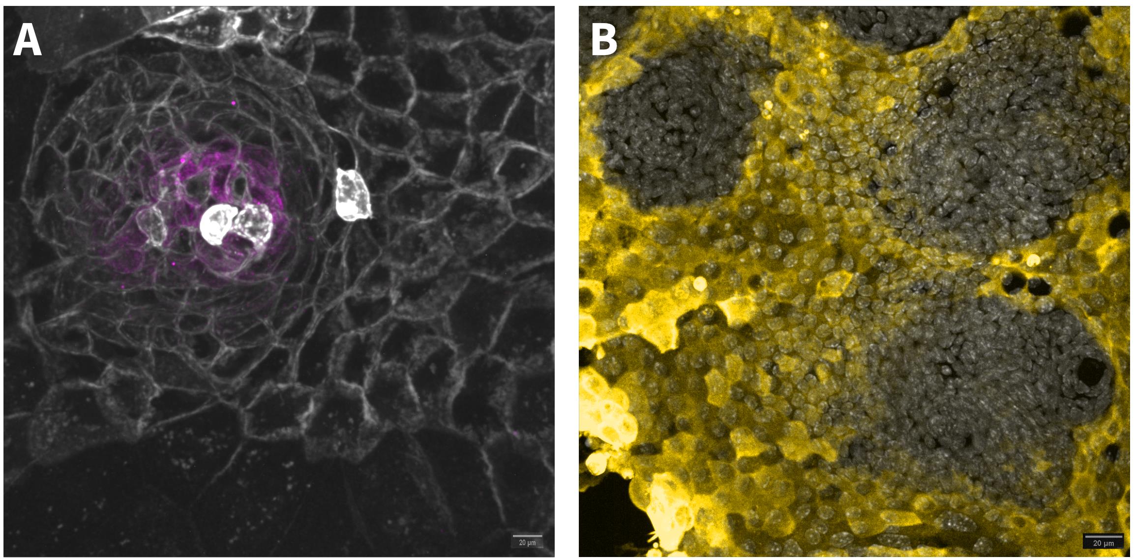 Figure 2. Antibody staining to validate crypt-like region and differentiated cells. (A) OLFM4 (magenta) staining in a crypt-like region. The monolayer was made from non-induced, tdTomato-expressing mT/mG (cre-recombinase-activated membrane-tomato/membrane GFP) organoids (grey). Scale bar: 20 μm. (B) Differentiated cells stained with AldoB antibody (yellow). Nuclei are stained with DAPI (grey). Scale bar: 20 μm.