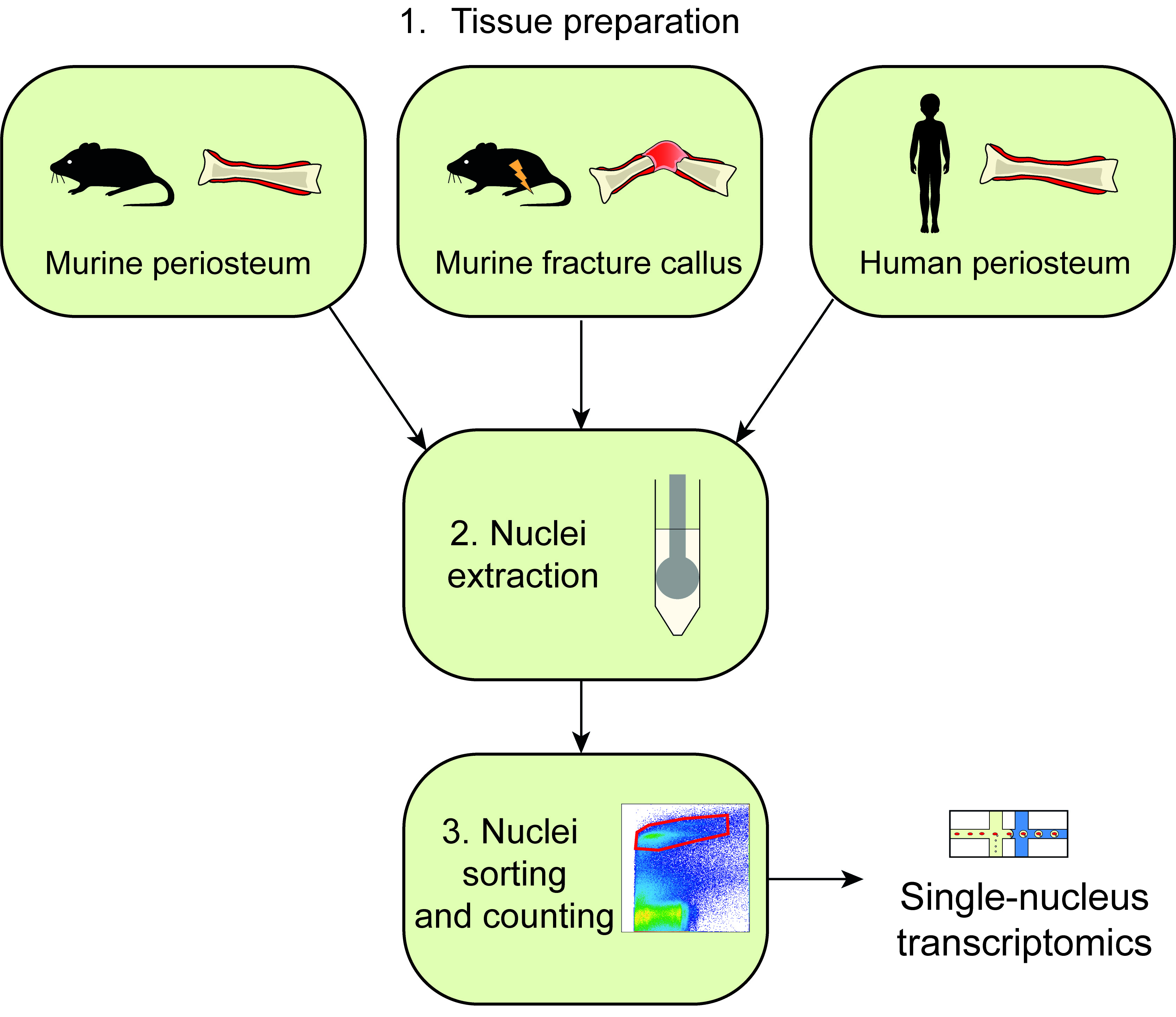 The periosteum is a thin and heterogeneous tissue covering the outer surface of bone that contains skeletal stem/progenitor cells (SSPCs) essential for bone repair. Following a bone fracture, periosteal SSPCs are activated and differentiate to form cartilage and bone cells [1–4]. SSPCs differentiate in a highly complex and dynamic environment marked by the presence of many cell types, including immune cells, endothelial cells, and cells from the nervous system [5,6]. To decipher the heterogeneity of the periosteum and the response of these different cell types to bone fracture, we aimed to perform single nucleus/cell transcriptomics from the periosteum and callus tissues. Cell isolation using enzymatic digestion is commonly used, but there are several disadvantages to this method. First, enzymatic tissue digestion can favor the representation of certain cell types. This usually leads to the overrepresentation of cell types loosely attached to the matrix, such as immune cells, and to the limited coverage of cell types embedded in the matrix, including osteoblasts, osteoclasts, and Schwann cells. Second, FACS-sorting and single cell transcriptomic techniques have constraints in terms of the cell size that can be processed. The fracture callus contains large cells such as hypertrophic chondrocytes and osteoclasts that are not compatible with these techniques. Third, enzymatic digestion needed for single-cell RNA sequencing (scRNAseq) can only be performed on fresh tissues and induces a stress response leading to transcriptomic changes[8]. To overcome these limitations, we optimized and tested a protocol to isolate nuclei from fresh and frozen tissues to perform single-nucleus RNA sequencing (snRNAseq). Several studies have shown that snRNAseq can produce similar results as scRNAseq and capture a greater diversity of cell types [7–11]. Here, we detail three distinct ways of using our protocol in order to isolate nuclei from (i) fresh murine periosteum, (ii) fresh murine fracture hematoma/callus, and (iii) frozen human periosteum. While tissue preparation can change between the different types of samples, the nuclei extraction protocol is common and based on mechanical cell lysis. Nuclei extraction is followed by fluorescence-activated nuclei sorting to eliminate the yields of cellular and matrix debris in the suspension. Overall, this protocol is fast and easy-to-use and is currently the most adequate method to capture the periosteal heterogeneity in vivo.