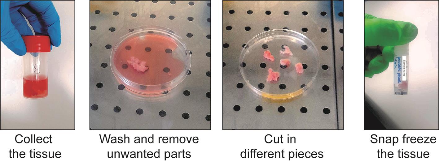 b. Under a cell culture hood, remove the tissue from the tube and place it in a sterile Petri dish. Wash the tissue with RNase-free ice-cold PBS to remove the remaining medium and blood (Figure 3, middle left).