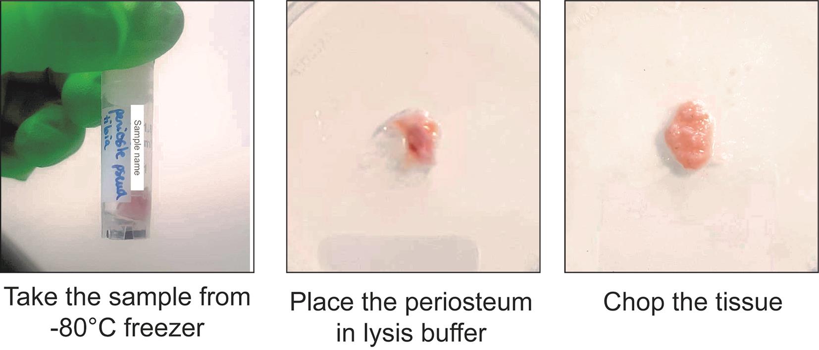 d. Cut the periosteum into pieces of at least 0.5 × 0.5 cm. Place the pieces briefly in a dry Petri dish to remove the medium from the tissue (Figure 3, middle right).