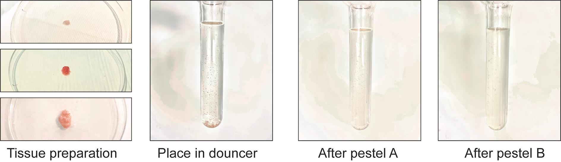 1. Put the tissues prepared in parts B, C, or D in a glass douncer. Add up to 7 mL of ice-cold lysis buffer (Figure 5, left, middle left).