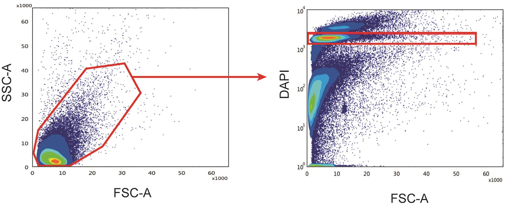 Figure 6. Sorting strategy to obtain a nuclei suspension without debris. The suspension is first gated based on SSC-A and FSC-A to remove larger debris (left), and nuclei are selected based on DAPI fluorescence (right).