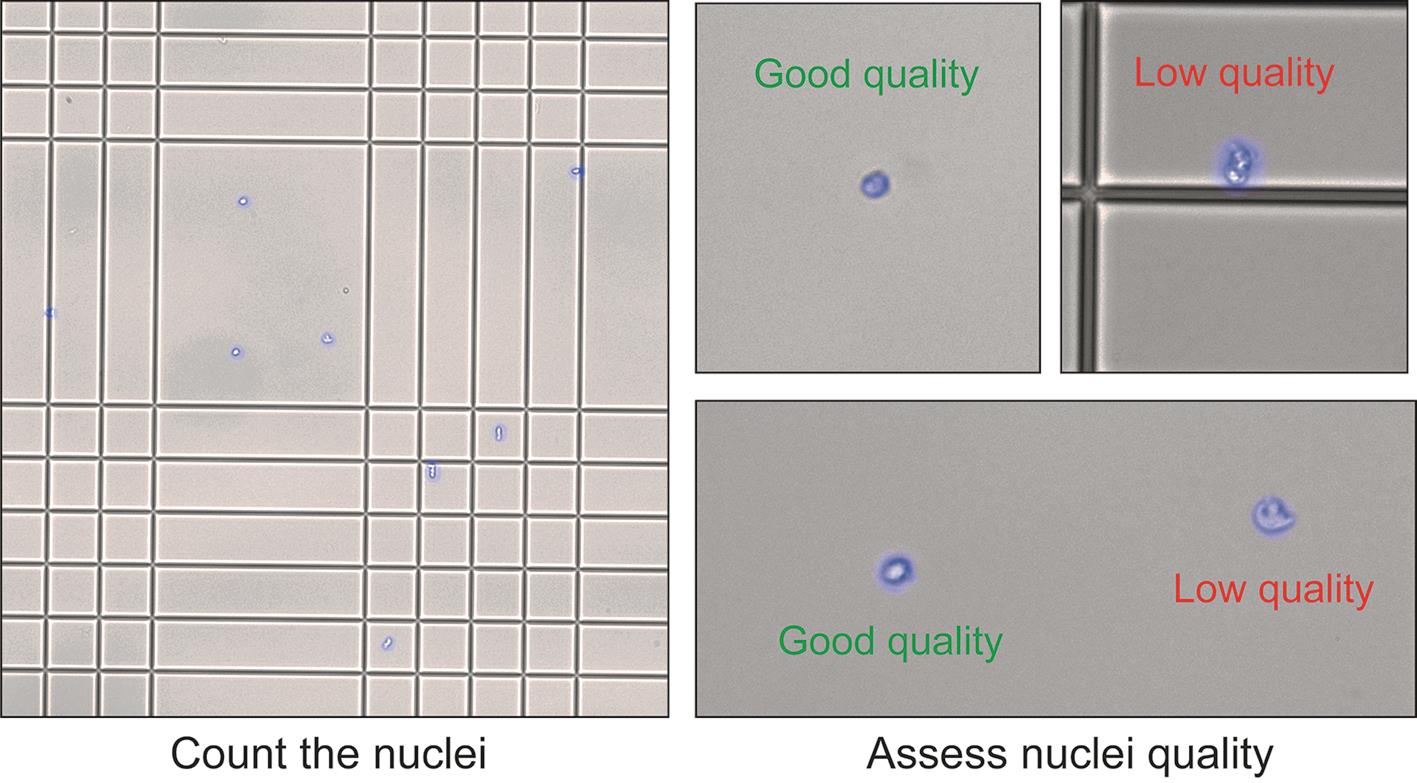 Figure 7. Nuclei counting and quality check. Nuclei should have a clean round shape. Nuclei with abnormal shape, unclear boundaries, and altered membranes are considered low quality.