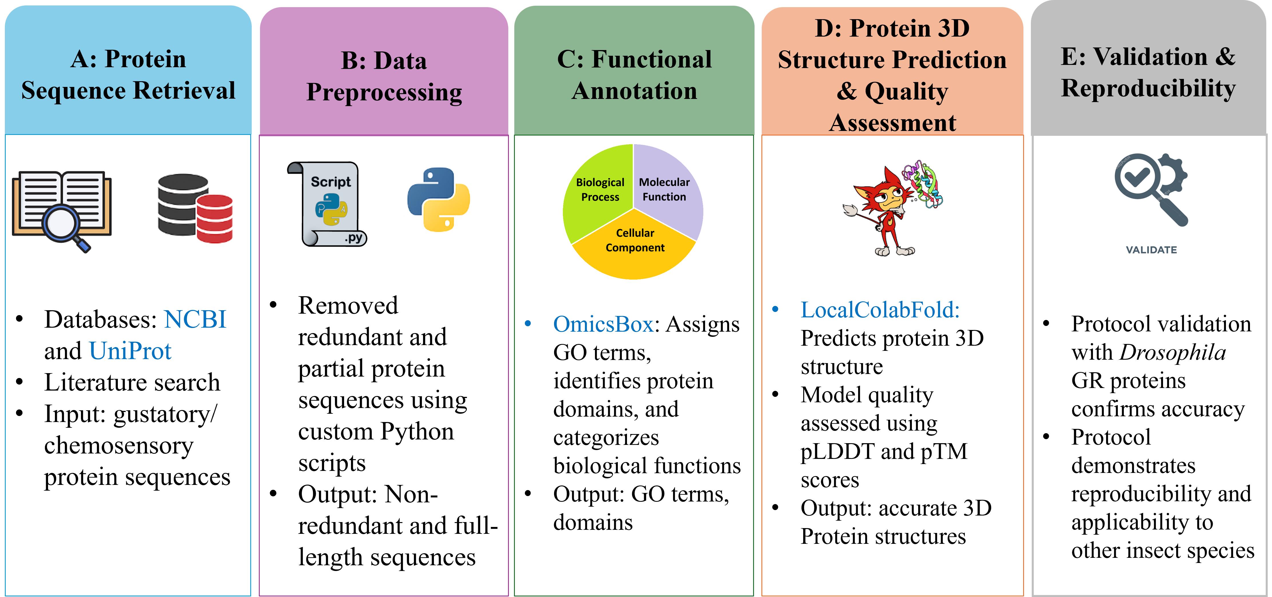 This workflow was validated through comparison of RPW GRs with proteins from the well-characterised fruit fly (Drosophila melanogaster), confirming its accuracy and reproducibility. This benchmarking demonstrates the pipeline’s ability to generate consistent, biologically meaningful results and highlights its applicability across insect species. Unlike previous studies that addressed annotation or structural modelling separately, our protocol integrates both, providing a holistic characterisation of GR proteins. Its reproducibility, adaptability, and biological relevance make it a reusable framework for advancing insect chemosensory research and supporting innovative pest management strategies.