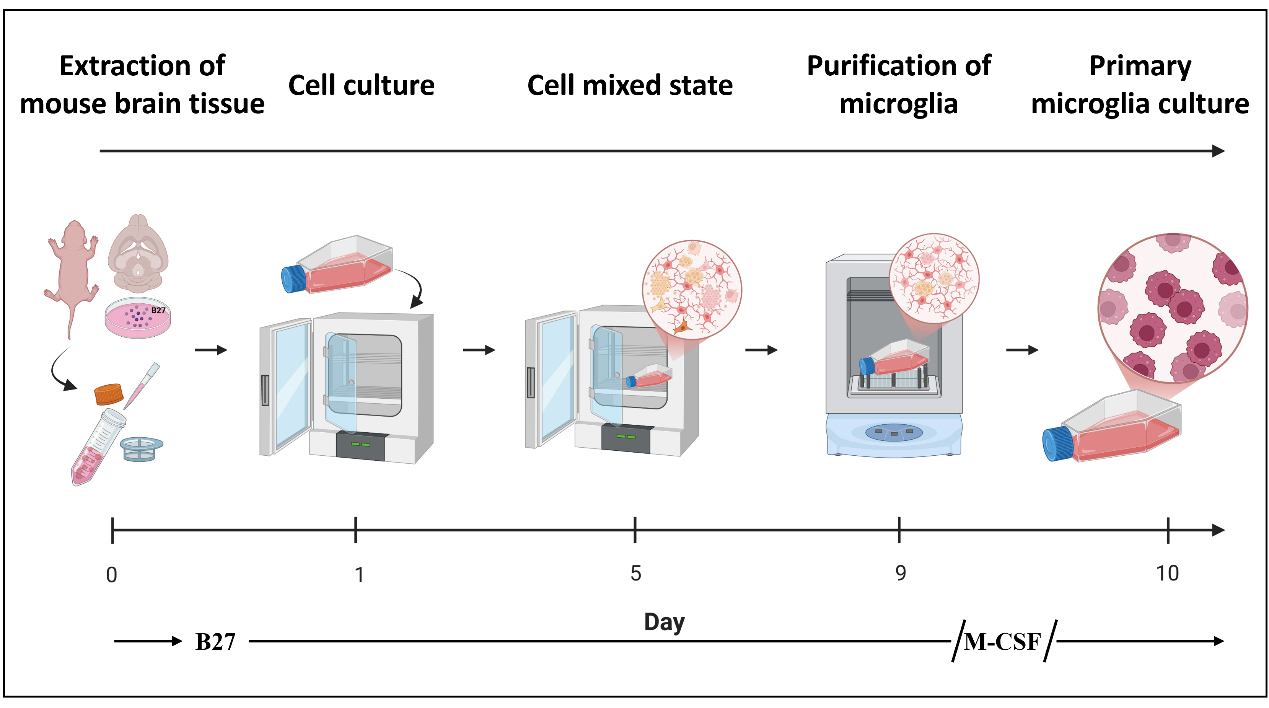 Microglia are the resident immune effector cells of the central nervous system (CNS), endowed with essential functions such as phagocytosis of pathogens and clearance of apoptotic cells. They are primarily responsible for maintaining neural homeostasis, mediating inflammatory responses, and contributing to tissue repair. Increasing evidence has highlighted their pivotal roles in pathological conditions, including neurodegenerative diseases, brain injury, and psychiatric disorders, which have become major focuses of contemporary neuroscience research [1–4]. Although several established in vitro models, such as the murine BV2 microglial cell line, are widely used, they exhibit intrinsic limitations as experimental systems [5]. In detail, the immortalization of BV2 cells may lead to aberrant gene expression, dysregulated signaling pathways, and altered metabolic states. Compared with primary microglia, BV2 cells lack key homeostatic features and immune functionalities, making them less suitable for accurately modeling the physiological responses of microglia in Parkinson’s disease (PD) [6]. Consequently, obtaining primary microglia with both high yield and high purity is of great importance for mechanistic studies in molecular neuroscience. Furthermore, in vitro experiments employing purified primary microglia provide a controllable and physiologically relevant model for dissecting activation pathways and intercellular interactions, thereby facilitating a deeper understanding of their functions under diverse pathological states.