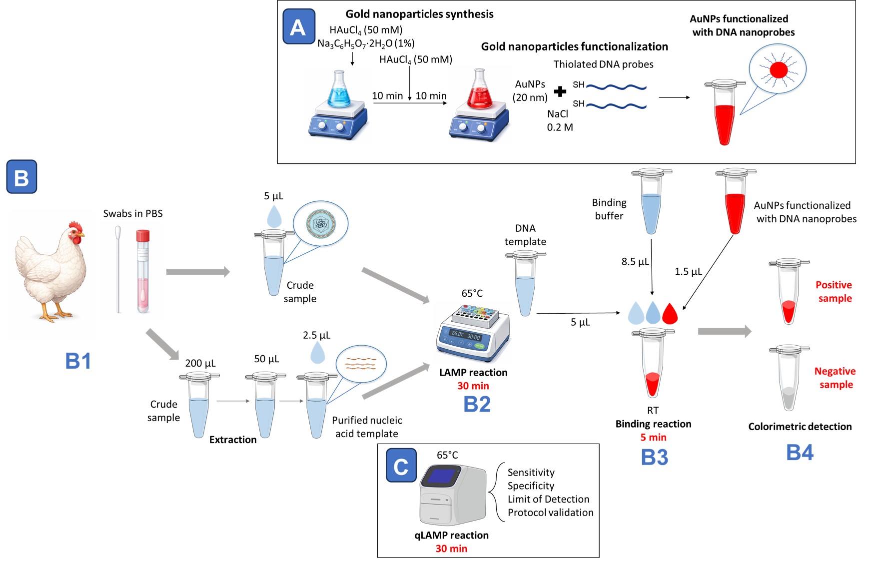 Workflow overview for avian respiratory virus detection combining loop-mediated isothermal amplification (LAMP) with AuNP-nanoprobe-based colorimetric readout. (A) For DNA-nanoprobe preparation, gold nanoparticles with a diameter of approximately 20 nm are synthesized using a two-step citrate reduction method and subsequently functionalized with thiolated DNA probes in the presence of NaCl. (B1) Oropharyngeal swabs collected in PBS are processed either as crude samples or following nucleic acid extraction. (B2) Samples are subjected to a 30-min LAMP reaction at 65 °C. (B3) After amplification, 5 μL of LAMP product is mixed with binding buffer (8.5 μL) and DNA nanoprobes (1.5 μL) and incubated at room temperature for 5 min. (B4) Hybridization with target DNA stabilizes nanoprobes in positive samples; in negative samples, absence of detection leads to nanoparticle destabilization and reaction clearing, enabling visual discrimination. (C) In parallel, qLAMP fluorescence reactions performed at 65 °C for 30 min are used to evaluate assay sensitivity, specificity, limit of detection, and overall protocol validation.