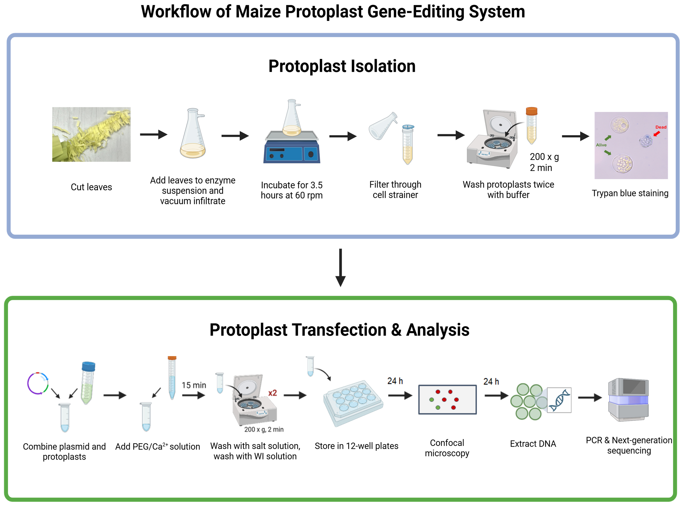 Genetic engineering of crops is an important strategy for improving yield, nutritional quality, and resilience to environmental stress. CRISPR/Cas9 has become a central tool in this work, yet the efficiency of guide RNAs (gRNAs) can be strongly influenced by chromatin accessibility, GC content, and local nucleotide context [1–4]. Stable transformation in maize remains a slow and resource-intensive process, often taking eight to nine months to regenerate plants and evaluate gene editing events [5]. As such, it is advantageous to evaluate gRNA performance before committing to stable transformation in immature embryos. Protoplast systems provide a practical solution, allowing gRNA activity to be tested in vivo in less than 1 week. However, existing protocols for maize protoplast isolation and transfection often produce variable results in yield, efficiency, and cell viability. For example, seedling growth conditions remain a point of debate, as many studies suggest that etiolated seedlings yield more viable protoplasts [6]. Additionally, cutting methods also influence recovery. While most protocols use horizontal leaf sections, vertical cutting has been shown to release more protoplasts per gram of fresh weight. This improved yield is especially valuable when plant material is limited. Transfection parameters often require high amounts of plasmid, with commonly used protocols requiring 20 μg of plasmid DNA, adding to the burden of plasmid preparation. Many established methods were designed for short-term assays such as luminescence or protein localization, where protoplast viability beyond 6–18 h is not necessary [7–9]. In contrast, gene editing requires cells to remain viable for at least 48 h to capture CRISPR-induced edits. The following protocol incorporates modifications to the methodologies presented in Yoo et al. (2007) and Gomez-Cano et al. (2019) [14,18] to improve yield, reduce DNA input, and extend protoplast viability. Although this protocol is described in the context of gene editing, these improvements can be applied to other monocot systems and adapted for various downstream applications. Additionally, extending protoplast viability allows for longer-term studies of cellular processes, such as protein localization [8,10], protein interactions [7,11], cell signaling [12,13], gene regulation [14], metabolomics [9], and transcriptomics [15]. Some considerations for the utilization of this protocol are that protoplasts cannot currently be regenerated into whole plants, and that edits introduced through non-homologous end joining (NHEJ) are random, so that sequence variants observed in protoplasts may not precisely predict edits recovered after stable transformation [16]. Despite this, characterizing gRNA efficiency in protoplasts is a critical evaluation tool, as high editing efficiency significantly increases the likelihood of generating desirable mutations in subsequent transformations.