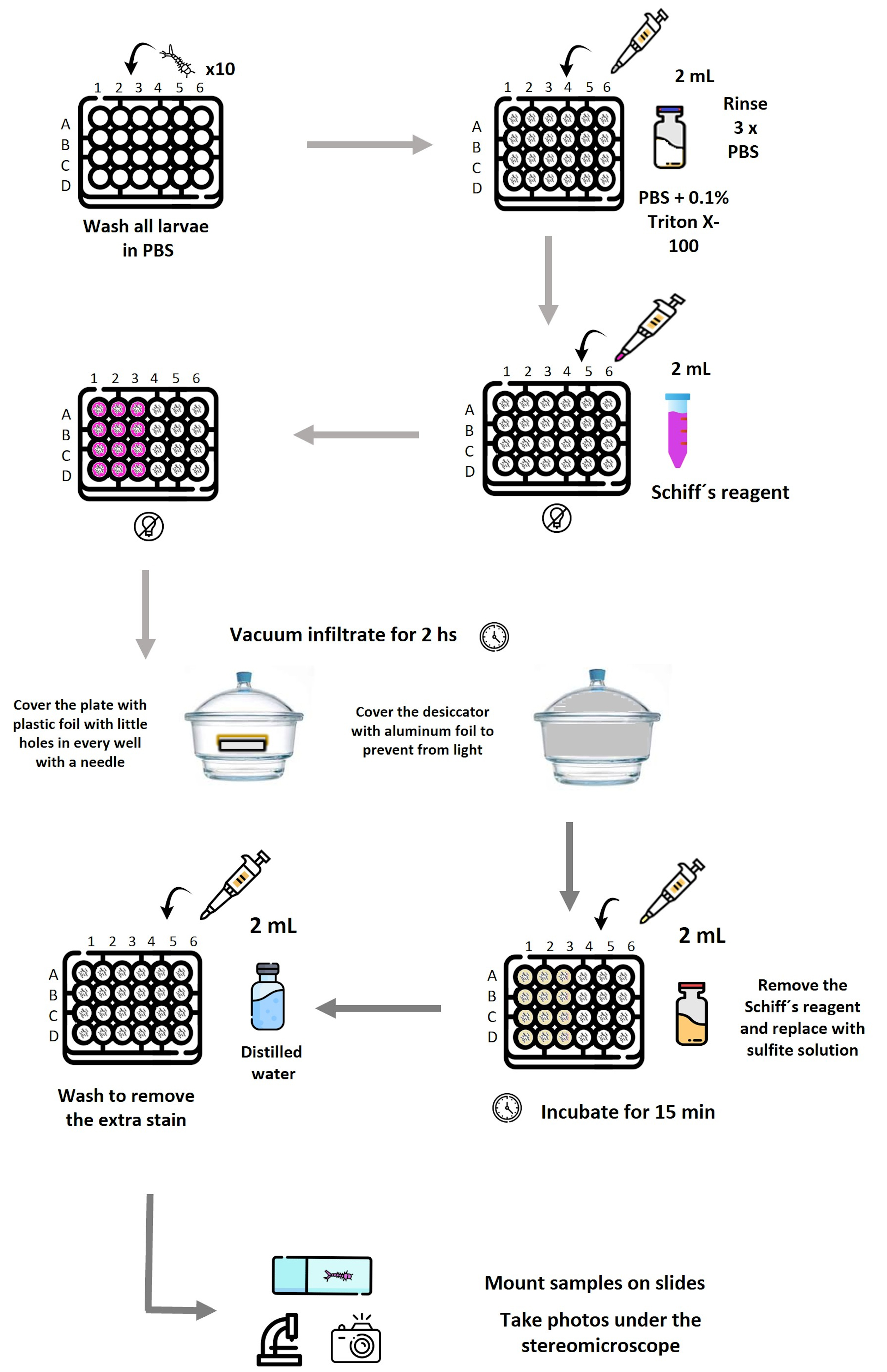 Schematic representation of the workflow used to detect lipid peroxidation–associated aldehydes in mosquito larvae by Schiff’s reaction. Larvae (10 per well) are distributed in a 24-well plate and washed in PBS, followed by permeabilization with PBS containing 0.1% Triton X-100 and subsequent PBS rinses. Schiff’s reagent is added where needed. The plate is covered with Parafilm, with holes in each well. Vacuum infiltration is applied in a desiccator covered with aluminum foil for 2 h to enhance reagent penetration. After staining, Schiff’s reagent is removed and replaced with sulfite solution to stabilize the coloration, followed by washing with distilled water to remove excess stain. Larvae are then mounted and photographed under a stereomicroscope. Reagent volumes (2 mL), incubation times, and light-protection steps are indicated at each stage. Plate layout: Row A, negative controls; A1–A3, stained with Schiff’s reagent; A4–A6, processed without Schiff’s reagent (unstained). Row B, positive controls exposed to 100 mM H2O2; B1–B3, stained; B4–B6, unstained. Row C, larvae exposed to live Synechocystis; C1–C3, stained; C4–C6, unstained. Row D, larvae exposed to ferroptotic Synechocystis; D1–D3, stained; D4–D6, unstained. Each experiment was performed in triplicate.
