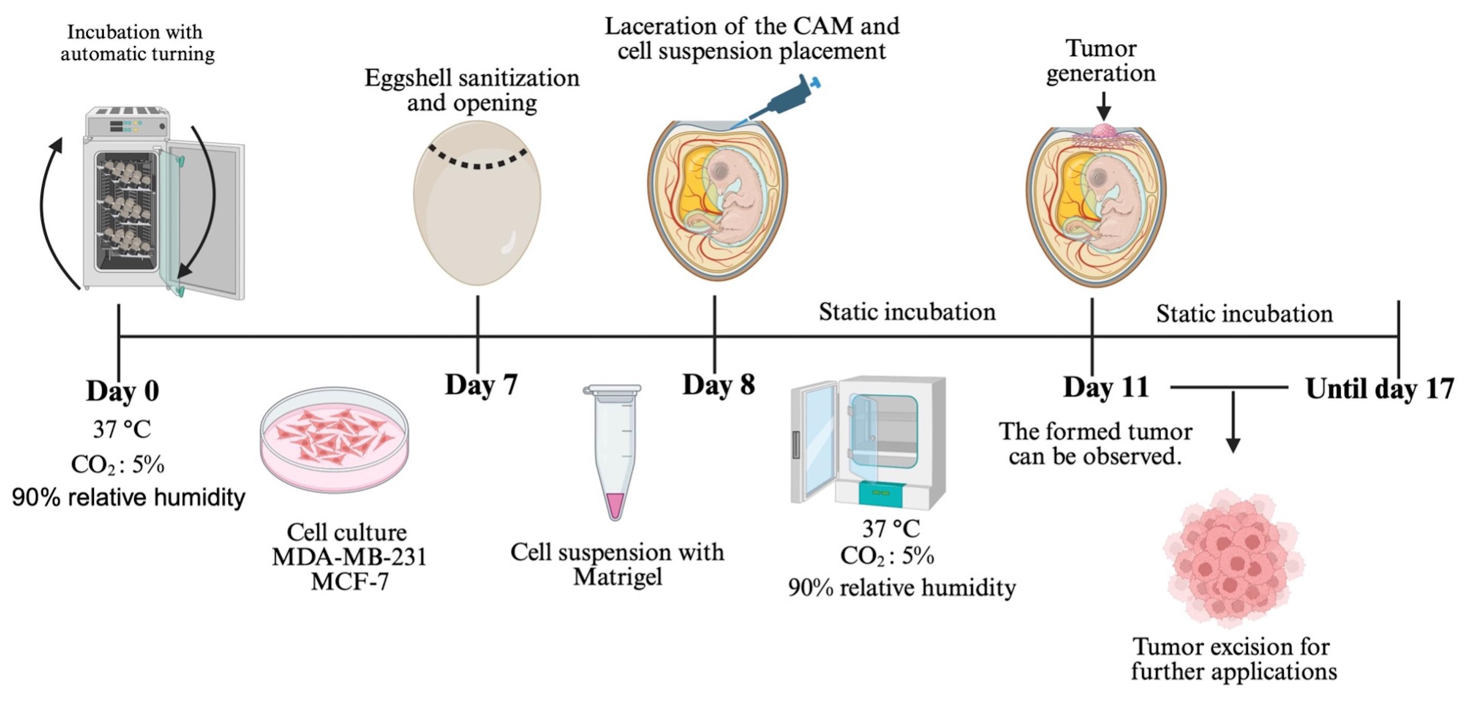 Chorioallantoic membrane (CAM) xenograft protocol. Fertilized eggs are incubated under automatic turning conditions until day 7, when eggshell windowing is performed. On day 8, the cell–Matrigel suspension is placed onto the exposed CAM. Embryos are maintained under static incubation, and tumor formation becomes visible from day 11. Tumors are collected for downstream applications.