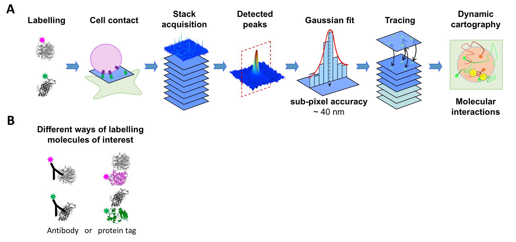 Single molecule tracking (SMT) is a powerful approach to investigate molecular dynamics in live cells, at the plasma membrane, in the cytosol, or in the nucleus (Figure 1A). Noteworthy, determining the position of a single fluorescent molecule at sub-resolution accuracy can be achieved using a two-dimensional (2D) Gaussian fit, provided there is a sufficient signal-to-noise ratio. We typically achieve ~40 nm lateral accuracy for living cell images (Sergé et al., 2008). Labeling and monitoring two molecular species by dual-color SMT allows for the comparison of their dynamic state and kinetic interactions in situ. Single molecule labeling can be done classically with fluorescently coupled antibodies (either primary alone, or primary and secondary), Fab fragments, and nanobodies, or by fluorescent proteins, such as GFP and its variants (in other colors or photoactivatable for instance). Additionally, protein tags such as HaloTag, SnapTag, and ClipTag, with their bright and stable fluorescent ligands, may also be utilized (Figure 1B). Each approach has its advantages and limitations, notably in terms of stoichiometry, steric hindrance, brilliance, and photostability (Achimovich, Ai and Gahlmann, 2019; Jacquemet et al., 2020; Lemon and McDole, 2020; Petazzi, Aji and Chiantia, 2020). There are already several SMT algorithms available, each of which vary in performance due to critical issues, such as signal-to-noise ratio and probe density (Manzo and Garcia-Parajo, 2015).