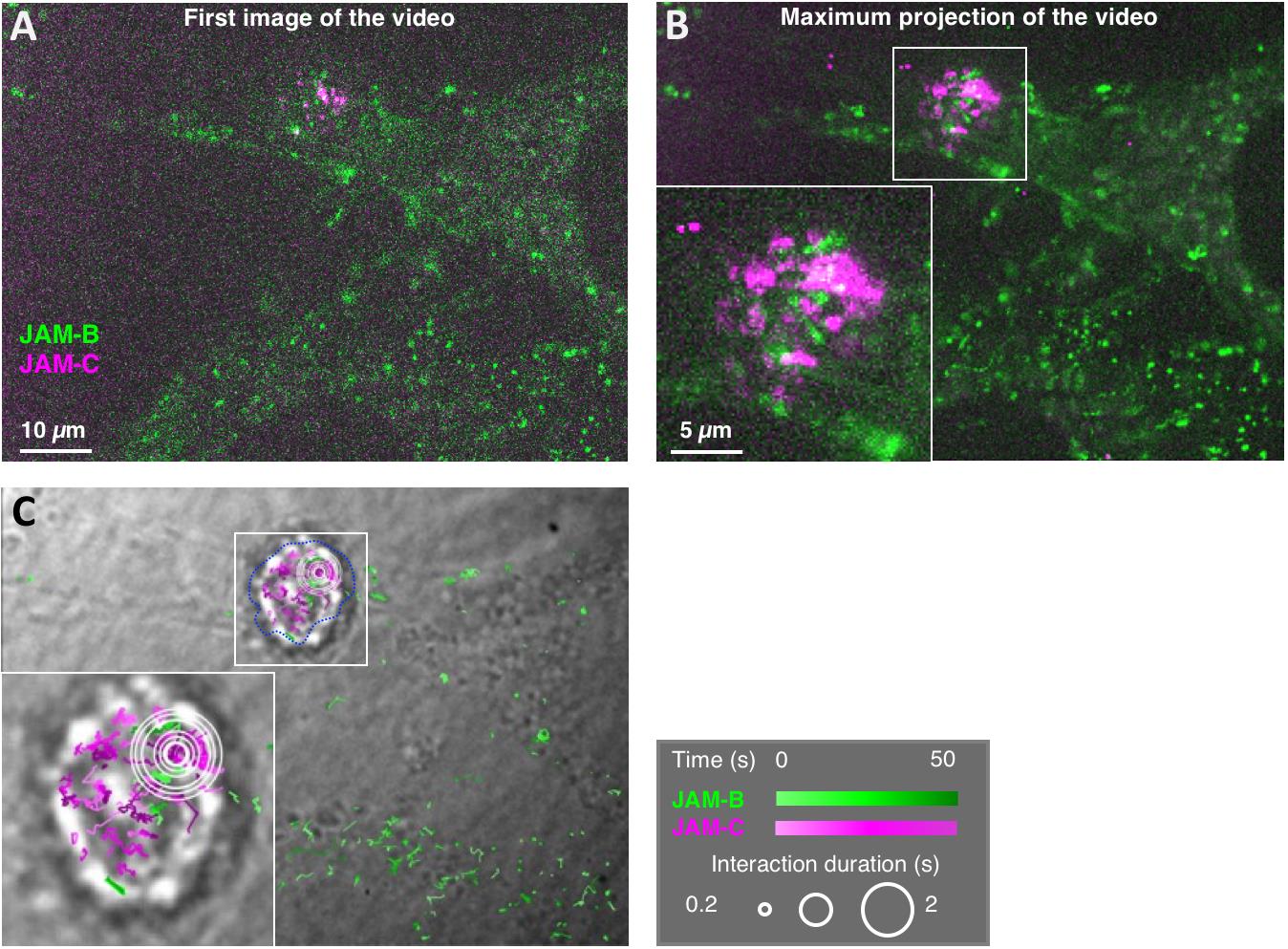 Figure 2. Representative videonanoscopy acquisition and MTT2col trajectory maps. (A) First image of a videonanoscopy acquisition, with the two colors combined into an RGB image. JAM-B staining on MS5 cells is in the green channel, and JAM-C staining on the KG1 cell is in the magenta channel. (B) Maximum projection of the video. (C) JAM-B and JAM-C single molecule trajectories are represented by green and magenta gradients, respectively, according to time, and superimposed on the transmission image of the cells (right). Inserts show magnifications of the framed areas around a leukemic KG1 cell. Spatiotemporal colocalizations are denoted by white circles, with a size proportional to duration. Several concentric circles correspond to successive colocalization events at nearby locations.