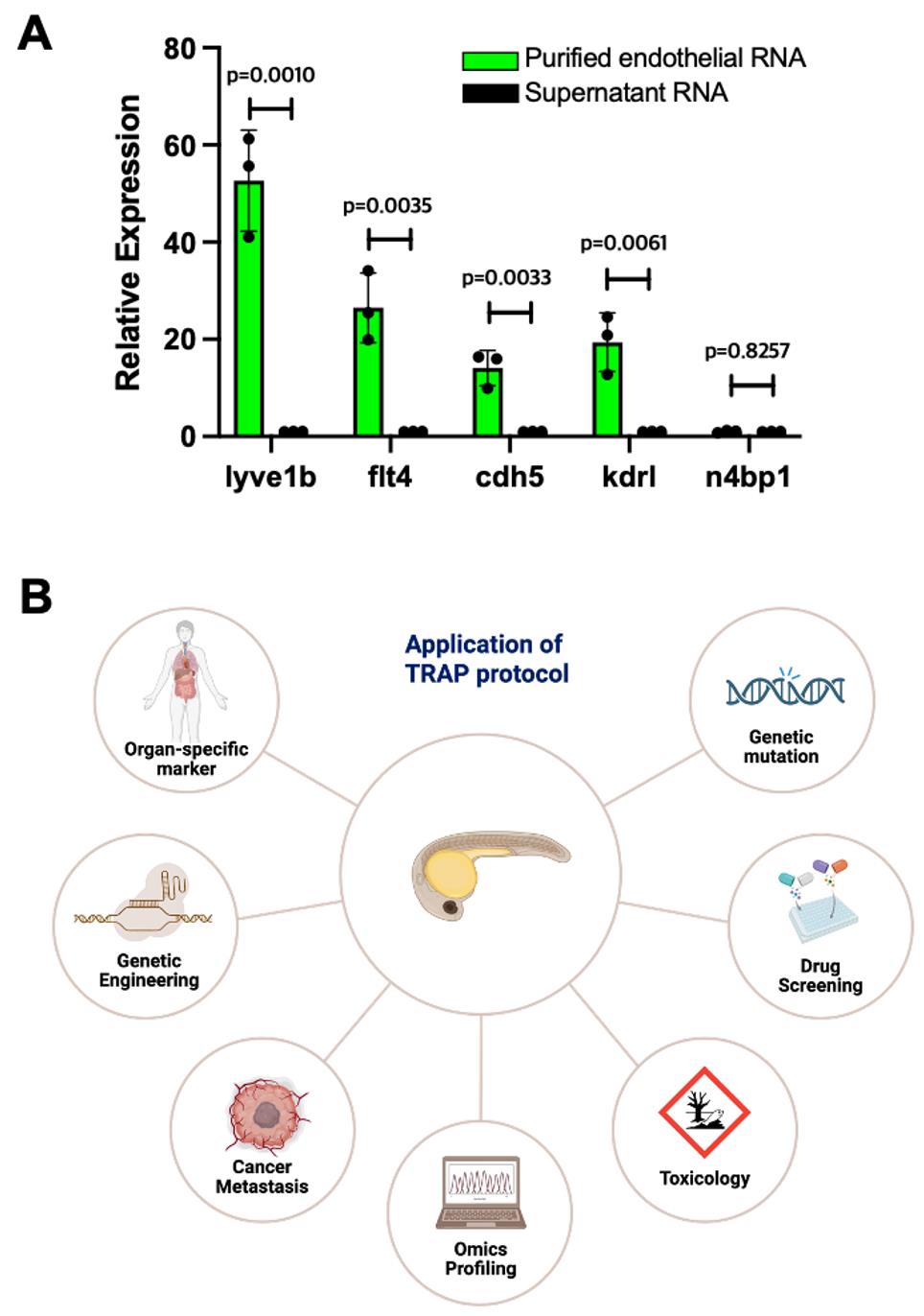 qPCR amplification curves and threshold cycle data were exported in .xlsx format for processing in Microsoft Excel. For each vascular gene, the ΔCT value was calculated by subtracting the cycle threshold (CT) of the reference gene (eef1a1) from the corresponding CT of the target (Ct_target–Ct_eef1a1). The ΔΔCT values were then obtained by subtracting the mean ΔCT of the supernatant control sample from each ΔCT value in both supernatant (sup) and purified endothelial (Endo) RNA. Fold changes in gene expression were calculated using the 2-ΔΔCT method. Replicate fold changes were averaged for each vascular gene and compared between endothelial and supernatant samples (Figure 3). The results show that the TRAP protocol, using the RiboTag strategy, efficiently enriches for specific endothelial gene markers such as lyve1b, flt4, and cdh5, while not enriching for ubiquitous genes like n4bp1 (Figure 3A). This technique enables targeted analysis of gene expression for selected cell types within complex tissue samples and can be applied in a range of clinical and research contexts to profile cell type–specific gene expression (Figure 3B).
