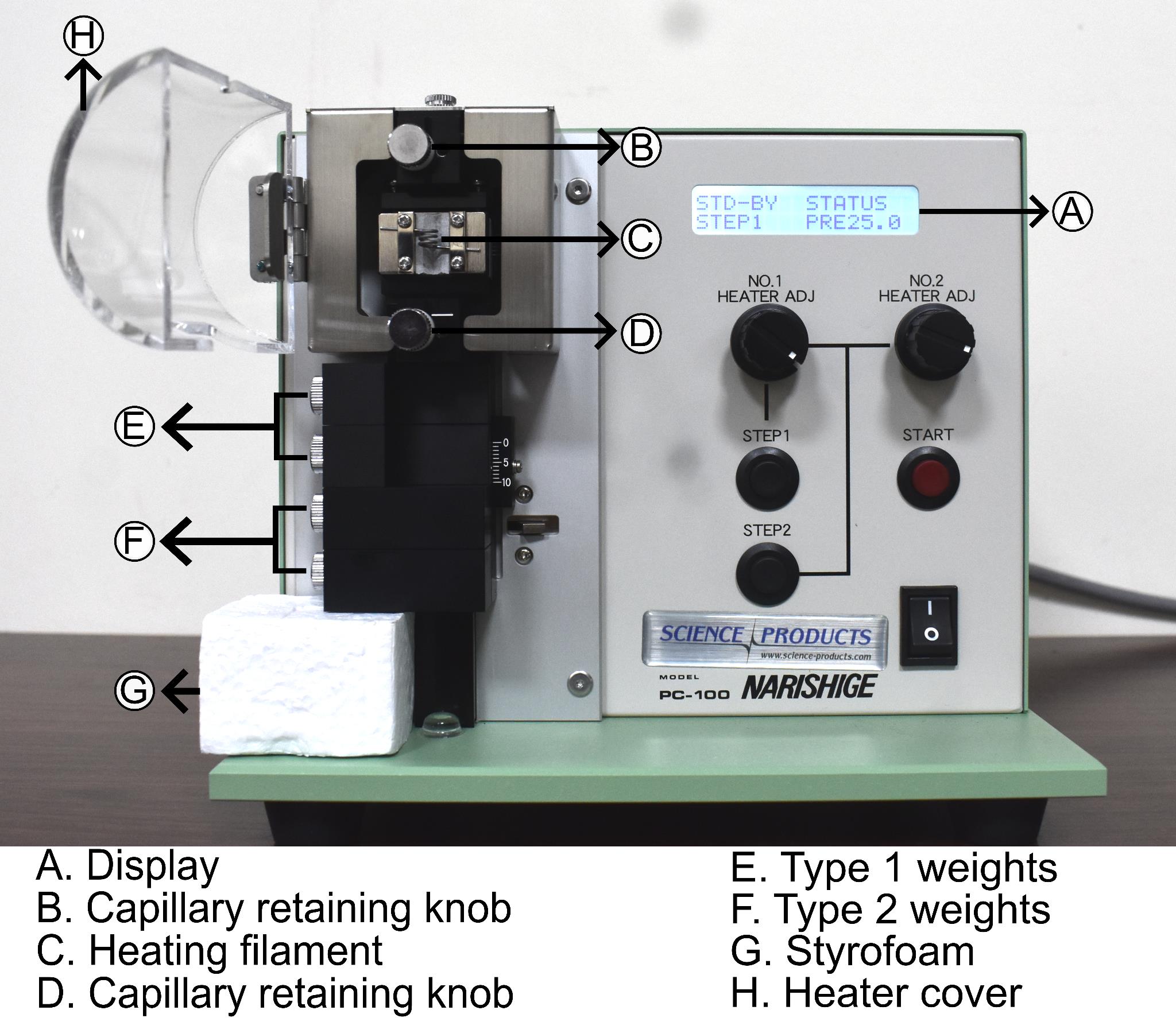 Figure 1. Narishige PC-100 pipette puller. Picture of the pipette puller showing (A) display, (B) upper capillary retaining knob, (C) heating filament, (D) lower capillary retaining knob, (E) type-1 weights, (F) type-2 weights, (G) Styrofoam block, (H) heater cover.