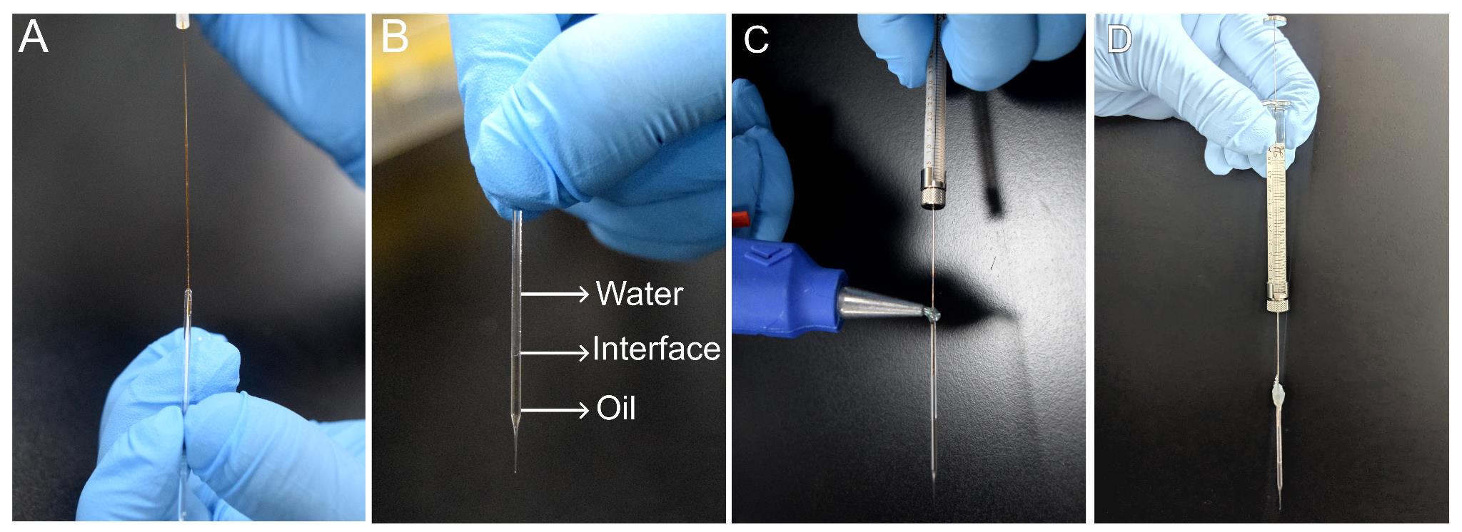 e. Ensure the glass capillary is centered and aligned with the middle of the heating filament to produce two evenly pulled capillaries.