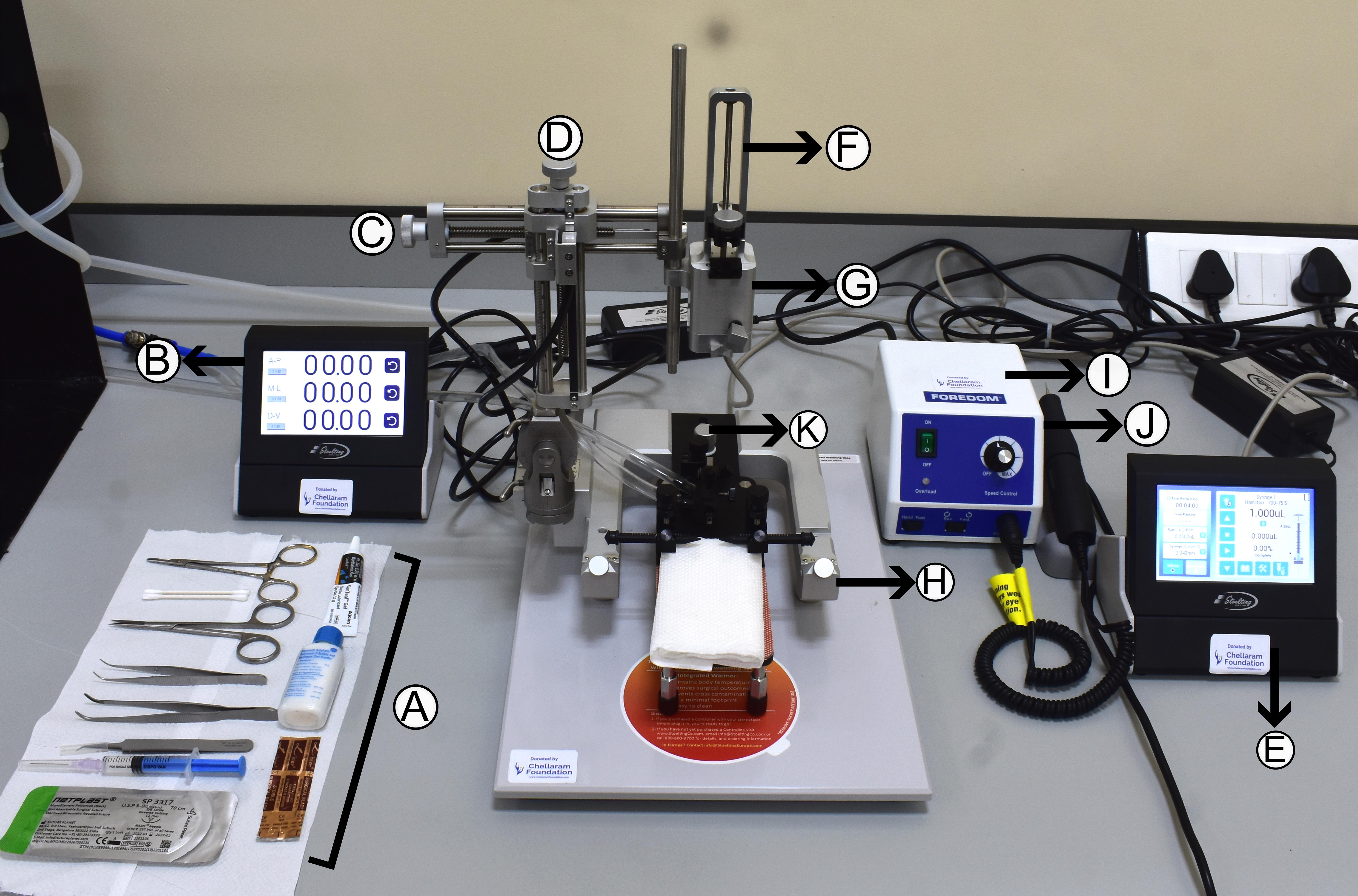 a. Drill burr holes at the above marked points with a handheld micromotor drill (0.2 mm bit) operated via foot pedal. Drill burr holes just enough to remove the overlaying skull and expose the brain without letting the drill touch the brain tissue. Clean the drilled area using a sterile cotton swab.