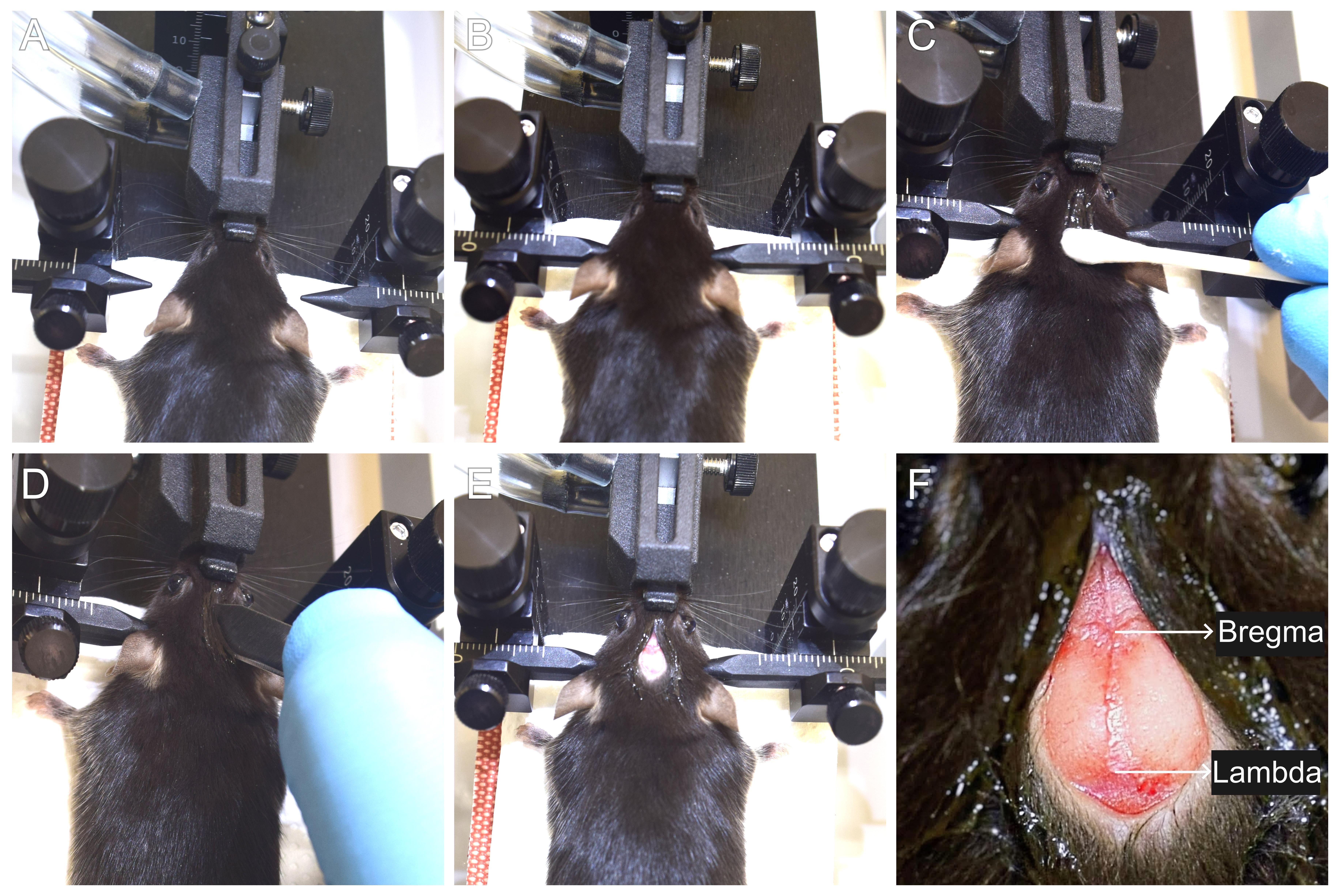 Caution: Excessive pressure can cause ear bleeding and hearing loss in mice. Care must be taken to gently fix the ear bars and then slowly adjust the knobs and tighten. When the mouse movements stop after fixing the skull, proceed with the next steps.