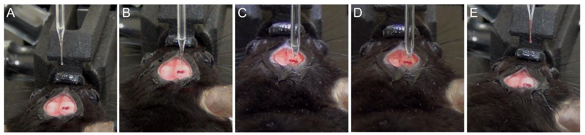 Figure 6. Stepwise process of infusion of the injection material. (A) Pre-test of the injection sample displaying a drop of injection material. (B) Positioning the capillary pipette above the burr hole. (C) Volume of the injection material at the start of injection in the coordinate of interest. (D) Glass capillary showing reduction in the volume of injection material post-infusion. (E) Post-test showing a drop of injection material at the tip of the glass pipette.