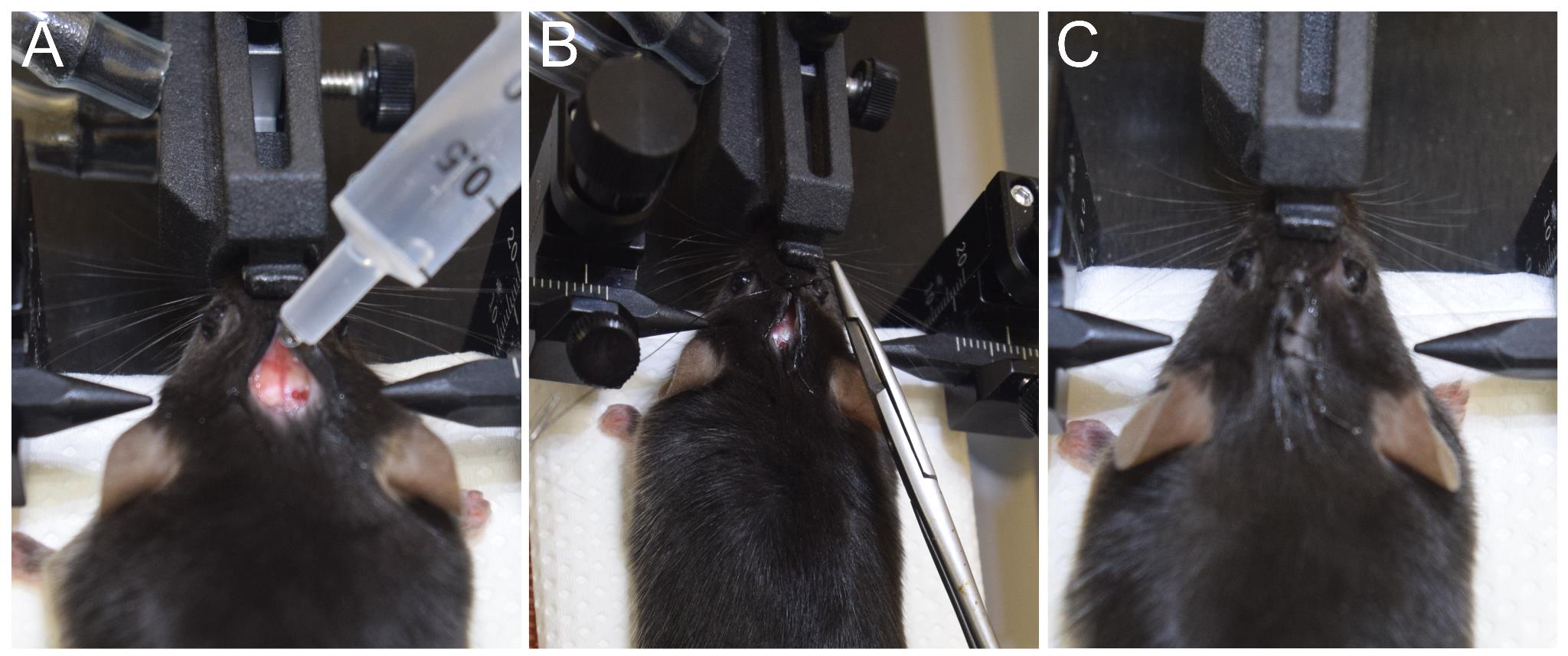 Figure 7. Incision closure by suture. (A) Hydrating the skin and skull using sterile 0.9% saline. (B) Suturing the skin using a reverse cutting needle with suture. (C) Sutured scalp of the mouse.