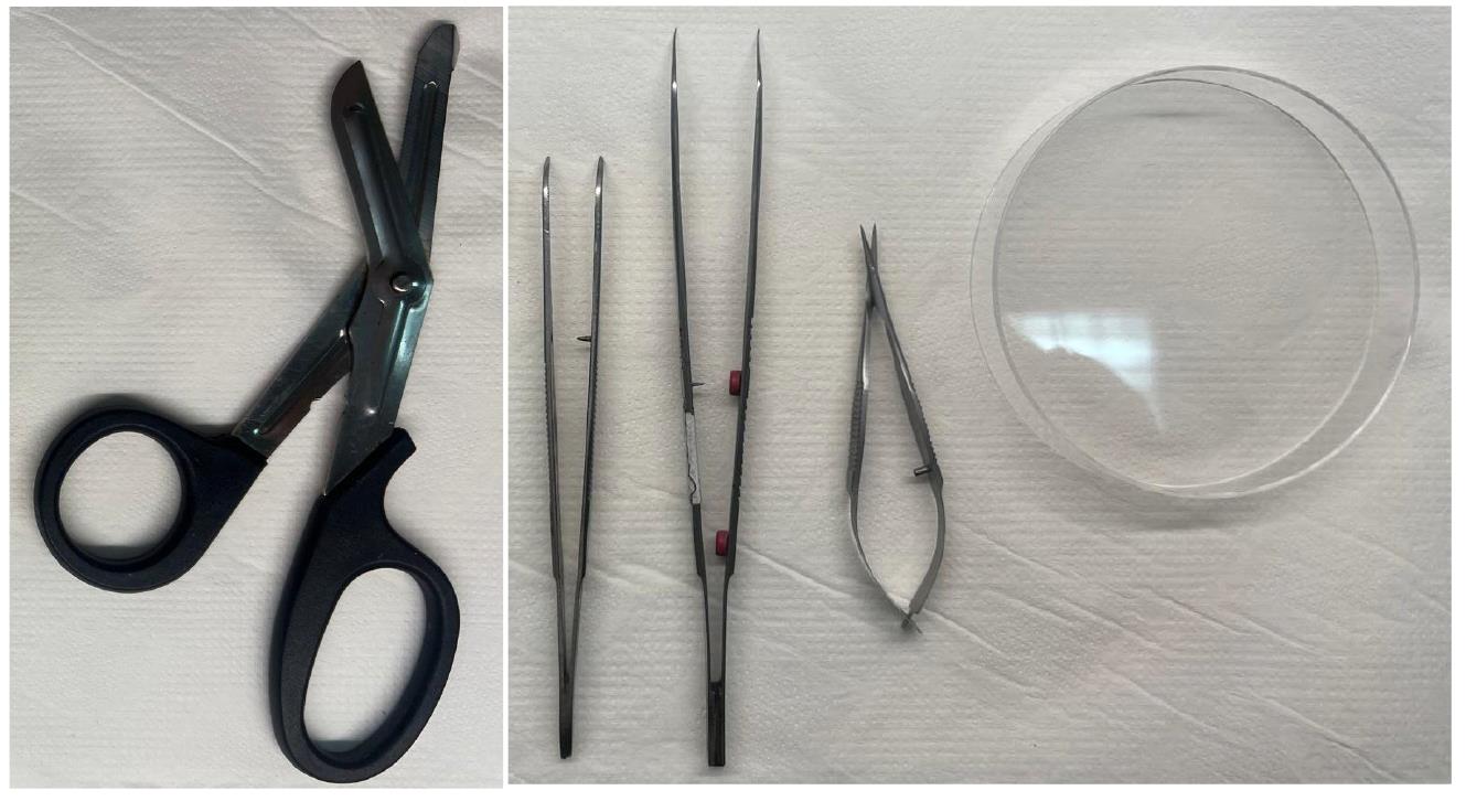 2. Amputate the hind paws with nurses’ scissors (Figure 1) and place them on a plastic dish cooled on ice.