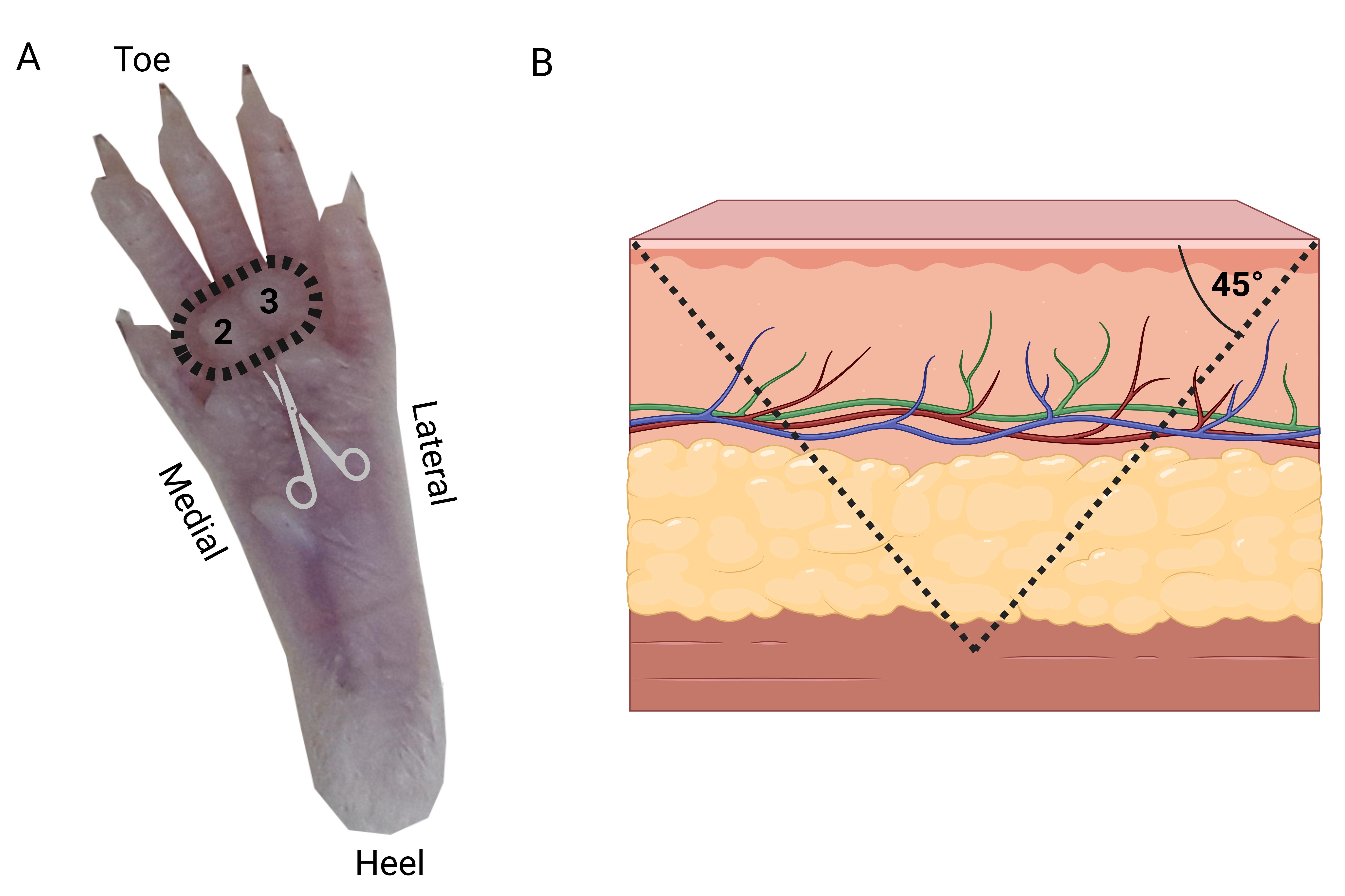 Figure 2. Hind paw footpads’ dissection. (A) The palmar surface of the paw is positioned facing upward. Dashed circle indicates the locations of the medial (#2) and lateral (#3) distal footpads selected for sampling. A conical skin sample, including the pads, is excised using Vannas scissors at an approximate 45° angle. (B) Schematic representation illustrating the angle and orientation of the skin tissue excision.