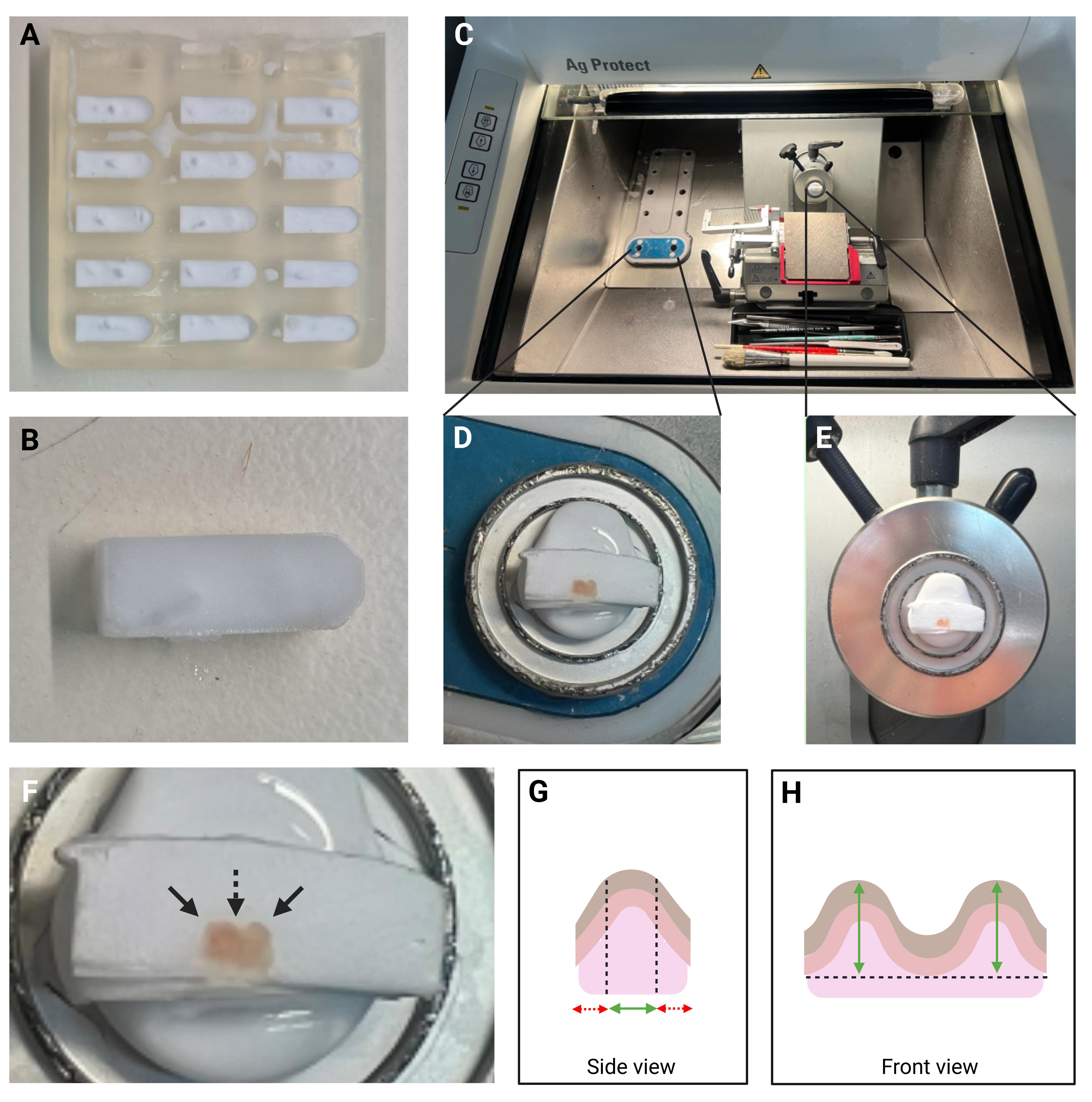 Figure 3. Tissue embedded in OCT compound positioned in the cryostat for sectioning. (A) Multiple frozen footpad samples embedded in OCT-filled silicon molds. (B) A frozen OCT block containing an embedded footpad sample immersed in the OCT before sectioning. (C) Overview of the cryostat showing the OCT-embedded tissue block. (D) Enlarged view of the cold stage with the OCT-embedded tissue block positioned for sectioning. The blocks are trimmed and, therefore, the footpads are visible. (E) Enlarged view of the disc chuck secured in the specimen head, demonstrating tissue mounting for sectioning. (F) Enlarged view of the tissue demonstrating two domes (indicated by solid arrows) separated by a central concavity (indicated by a dashed arrow). (G) Schematic side view of the biopsy showing the optimal and non-optimal cutting areas. The red dashed arrows represent regions that should not be collected, while the solid green arrow indicates the optimal region from which sections should be collected for staining. (H) Schematic front view of the biopsy showing the height of the domes in the optimal sectioning area (indicated by the green arrow). OCT: Optimal cutting temperature.