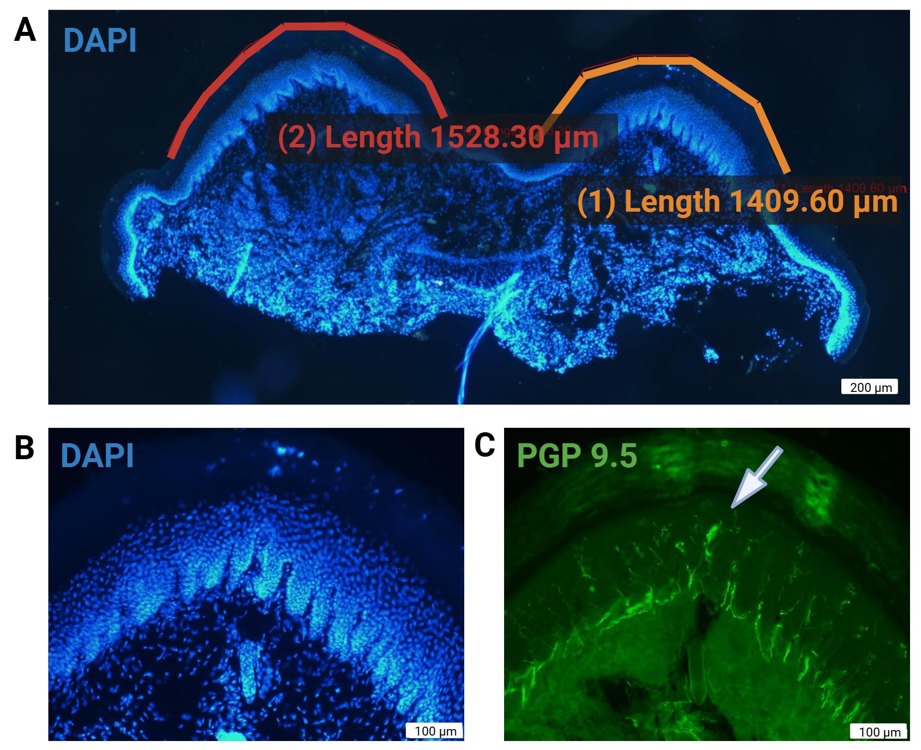 Figure 4. Representative images of skin sections for intraepidermal nerve fiber analysis. (A) Length measurement of epidermal surface across two digital pads using microscope software (4×, DAPI 405 nm channel). (B) Higher magnification (20×, DAPI 405 nm channel) DAPI-labeled basal keratinocyte cell layer. The papillary appearance of the dermis is highlighted by DAPI labeling. (C) 488 nm channel for detection of PGP9.5. Anti-PGP9.5 exhibits some nonspecific binding to dermal connective tissue, which can aid in identifying the dermal–epidermal junction and visualizing nerve fibers crossing it. At 20× magnification (20×), Meissner’s corpuscles can also be identified in the epidermis (white arrow). DAPI (4′,6-diamidino-2-phenylindole). PGP9.5: Protein gene product 9.5. Scale bars: 200 µm (A) and 100 µm (B and C).