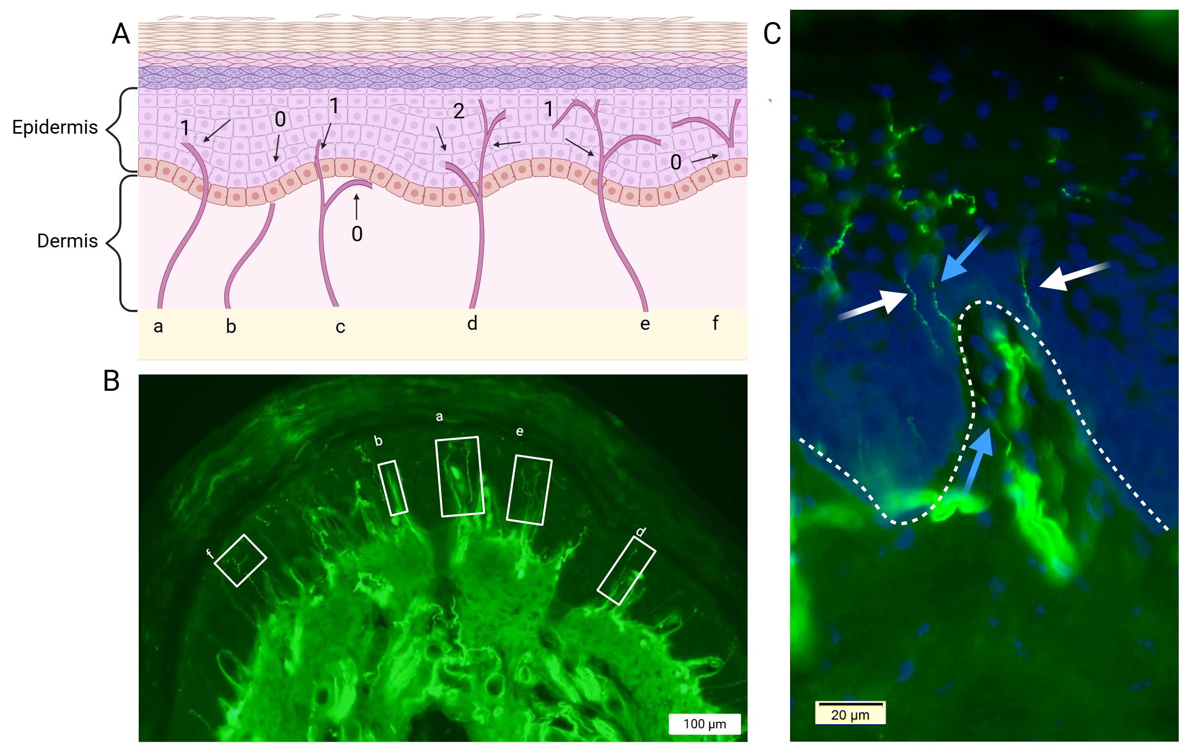 1. Quantification is performed by counting the number of fibers crossing the epidermal basal cell layer, i.e., entering the epidermis from the dermis region.