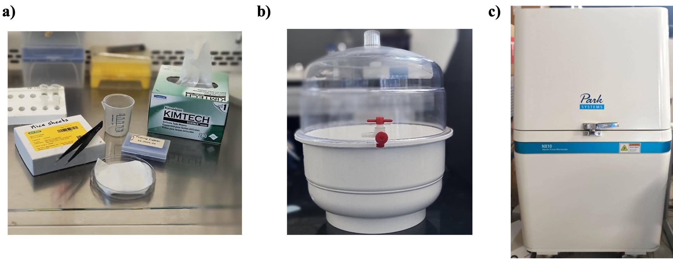Figure 1. Materials used in this protocol. (a) Experimental setup. (b) Desiccator. (c) Park Systems NX10 AFM instrument.