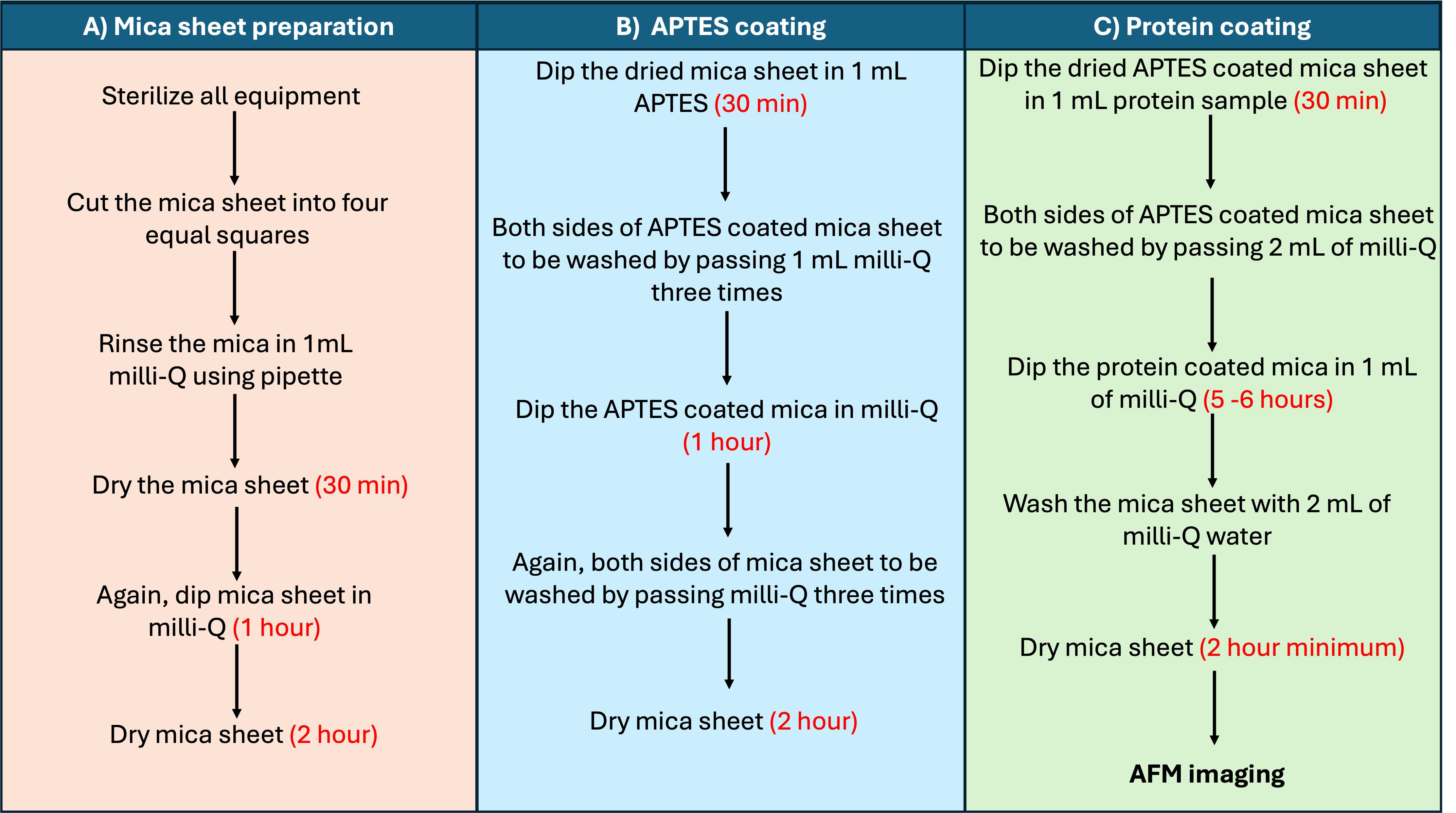 4. It is advisable to optimize the incubation time for coating the protein of interest onto the mica sheet surface, as well as the dip-washing and drying procedures, since these parameters can differ depending on the specific protein and condition used.