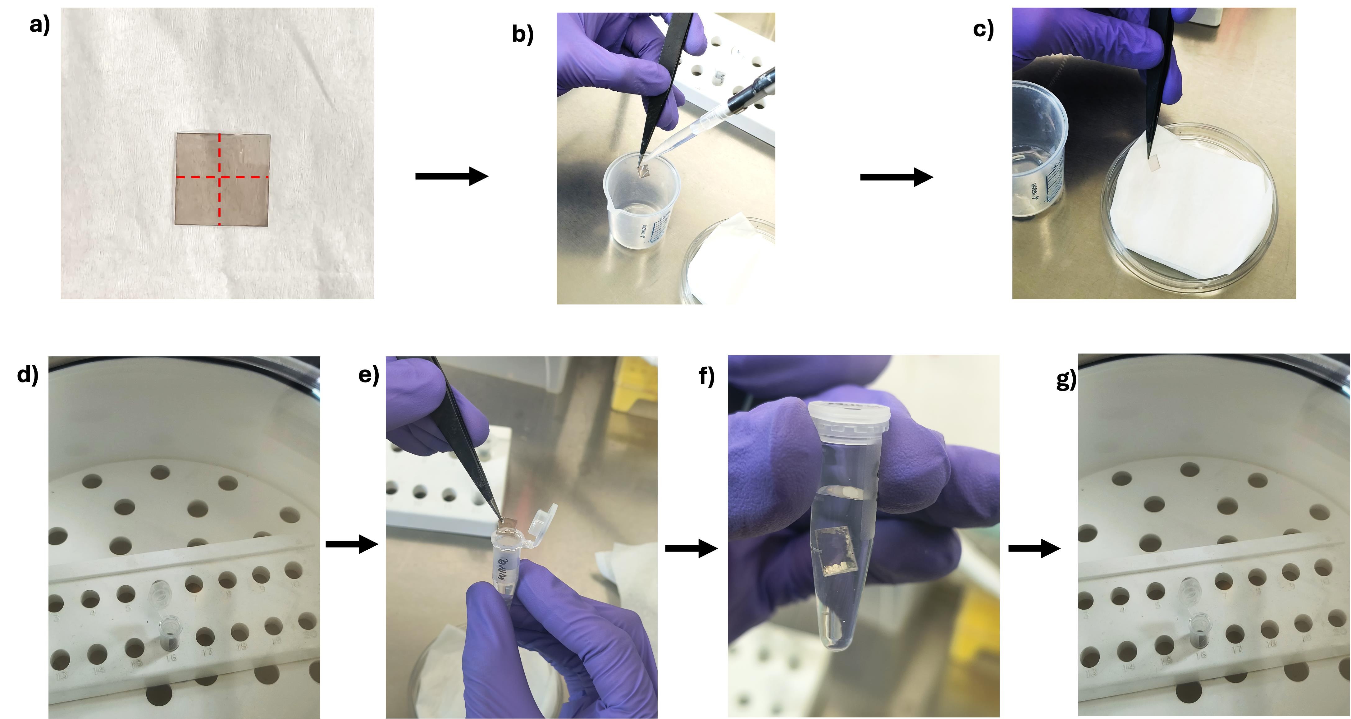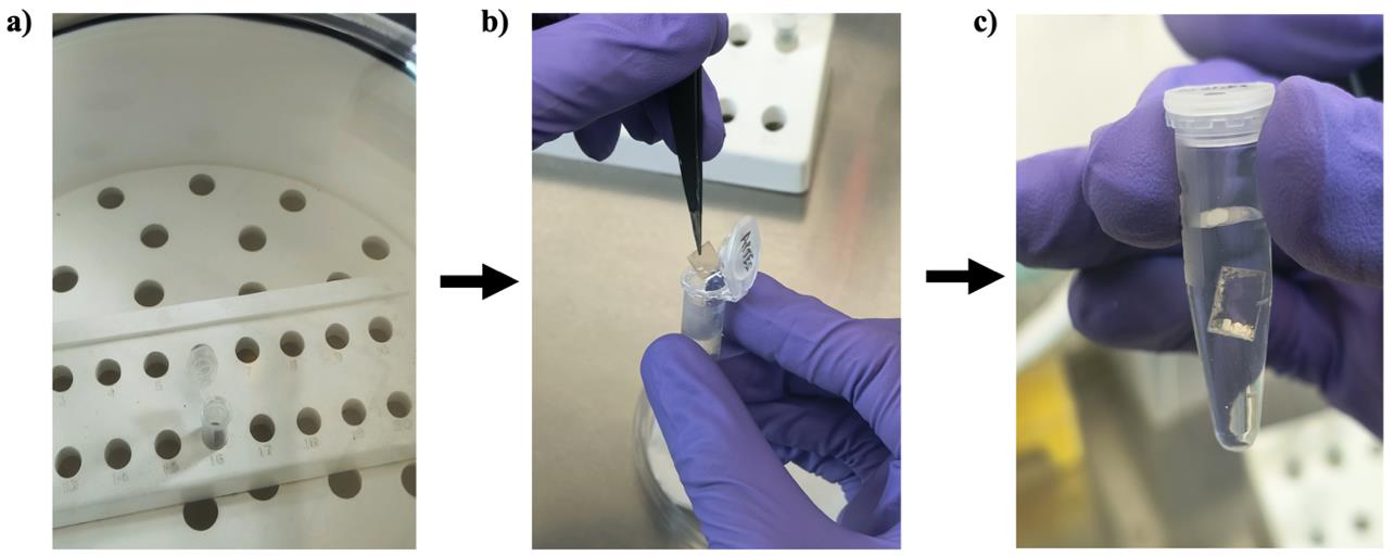 5. Subsequently, dip the mica sheet in 1 mL of Milli-Q water in a 1.5 mL microcentrifuge tube for 1 h (Figure 3e, f).