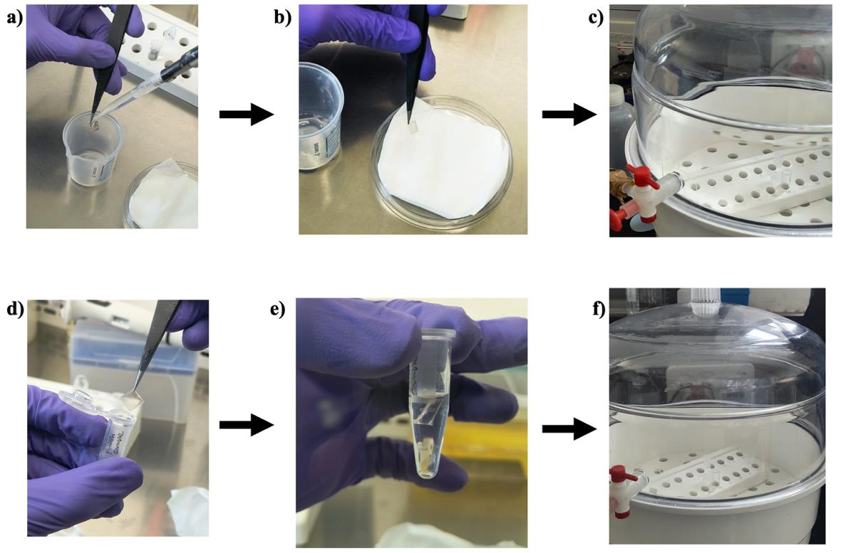 4. Place each mica sheet vertically inside a 1.5 mL microcentrifuge tube and dry it in a desiccator for 30 min (Figure 3d).