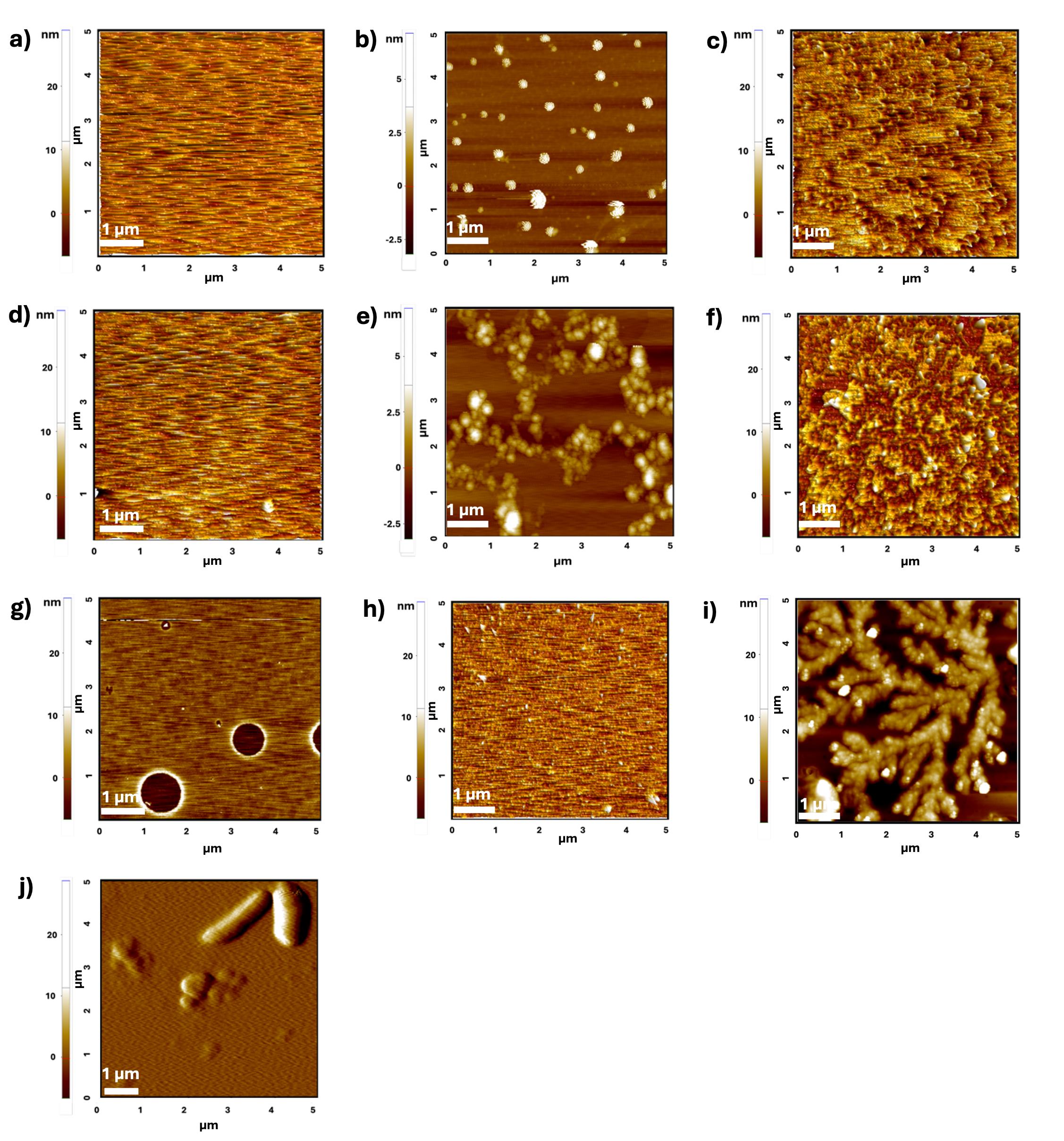 Figure 6. Representative atomic force microscopy (AFM) images of mica sheets at different stages of the protocol. (a) Empty mica sheet. (b) Unwashed mica sheet coated with 10 mM NaCl. (c) Mica sheet coated with 10 mM NaCl after washing with 200 μL of Milli-Q water. Note the partial removal of salt from the mica surface. (d) Mica sheet coated with 10 mM NaCl after washing with 3 mL of Milli-Q water. Note the complete removal of salt from the mica surface. (e) Unwashed mica sheet with 150 mM NaCl. (f) Mica sheet with 150 mM NaCl after washing with 200 μL of Milli-Q water. Note the significant presence of salt in the mica surface. (g) Mica sheet with 150 mM NaCl after washing with 3 mL of Milli-Q water. Note the removal of salts from the mica surface. (h) Mica sheet coated with 150 mM NaCl and 10 mM phosphate buffer (blank) after washing with 3 mL of Milli-Q water. Note the significant presence of salt deposits. (i) A dominance of salt fibrils (branched fibril morphology unlike amyloid or amyloid-like fibrils) hindering the fibril formation of Stm1_N1-113 occurs when washed simply with 3 mL of Milli-Q water. (j) Amyloid-like fibrils of 400 μM Stm1_N1-113 protein are seen when the protein was coated onto the mica sheet using the dip-washing protocol presented here. Note the absence of salt.