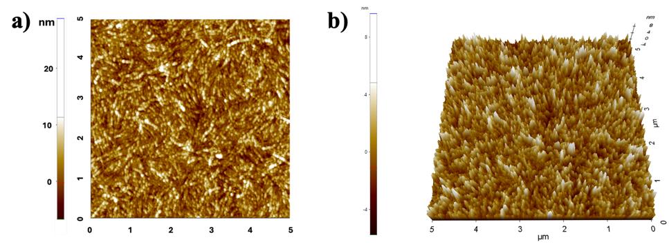 Figure 7. Atomic force microscopy (AFM) images of Aβ42 fibril (100 μM) captured after using the dip-washing protocol to coat the fibrils on the mica sheet. (a) 2D and (b) 3D image of Aβ42 fibrils.
