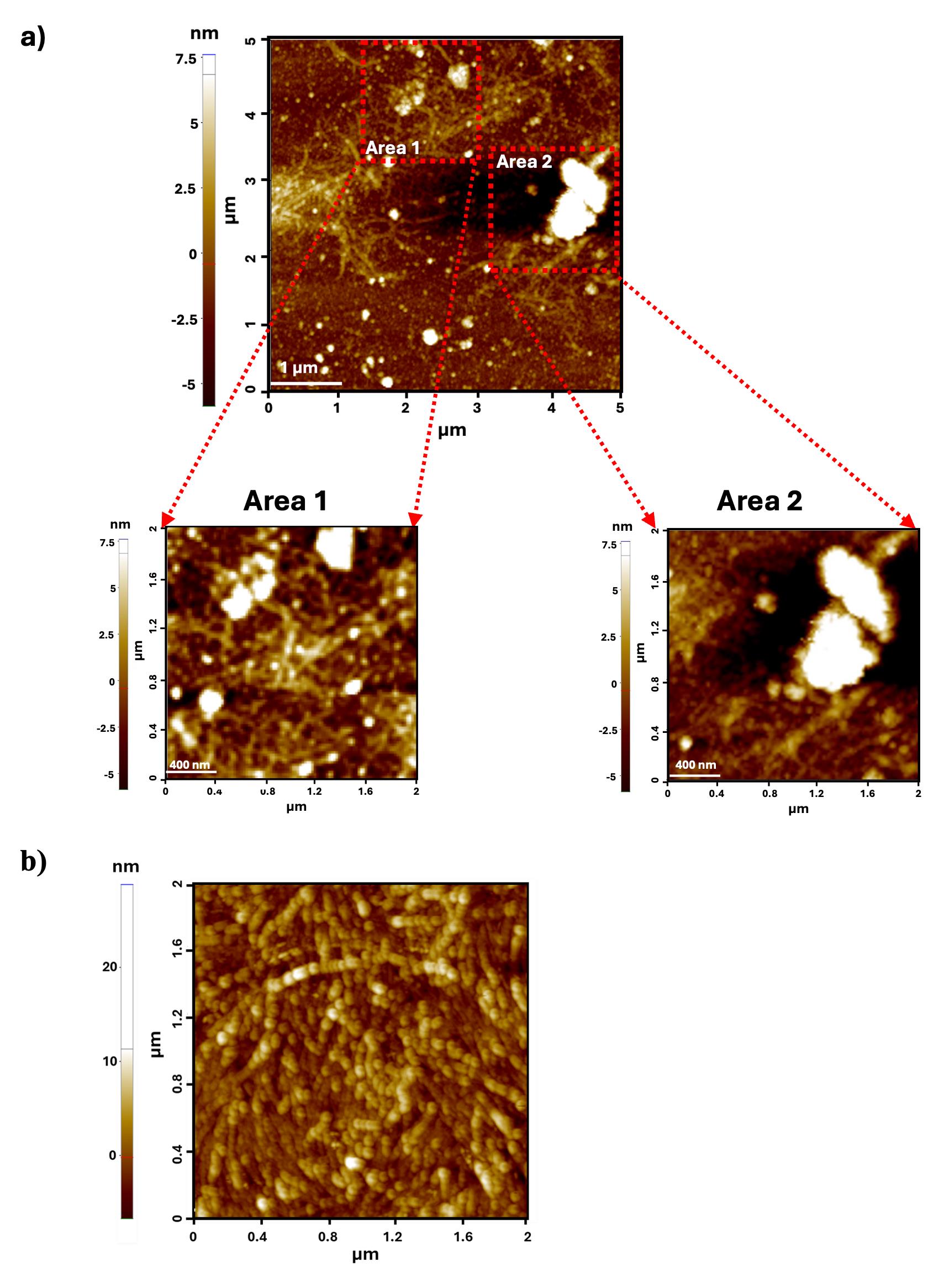 Figure 8 represents the comparative analyses of AFM images collected by the pipette-washing (Figure 8a) and dip-washing methods (Figure 8b). This analysis was performed using a 10 μM concentration of Aβ42 fibril mixed in 150 mM NaCl and 10 mM phosphate buffer. Note the persistence of salt, represented in Areas 1 and 2 in Figure 8a (inset: enlarged 2 × 2 μm scan of the selected areas from a 5 × 5 μm scan). In contrast, the 2 × 2 μm scan of the AFM image captured after dip-washing has no such salt deposits.