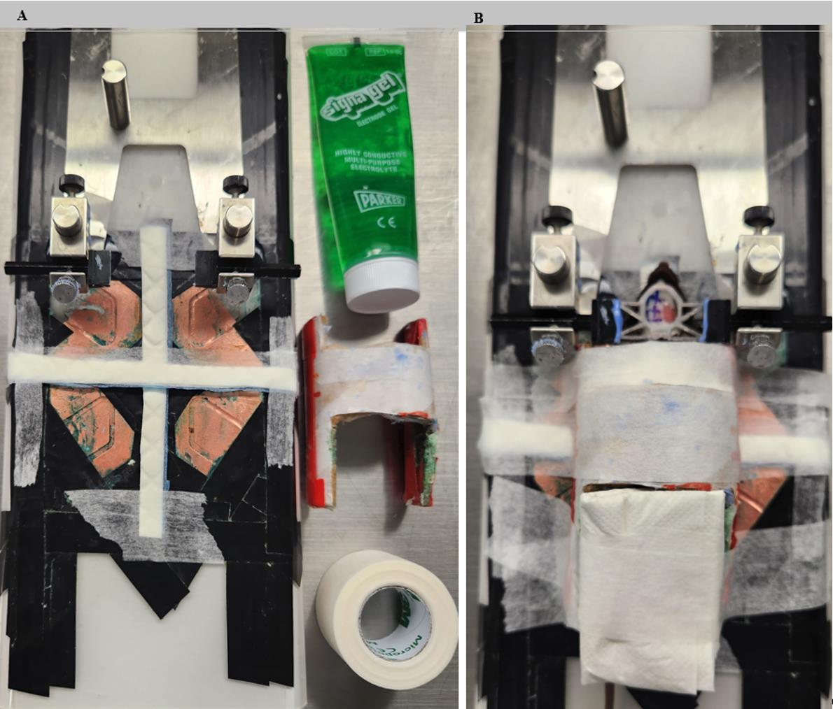 a. Cut copper tape (0.25 mm thickness, conductive adhesive) into four oval pads (approximately 4.5 × 2.5 cm) using scissors (Figure 1B).
