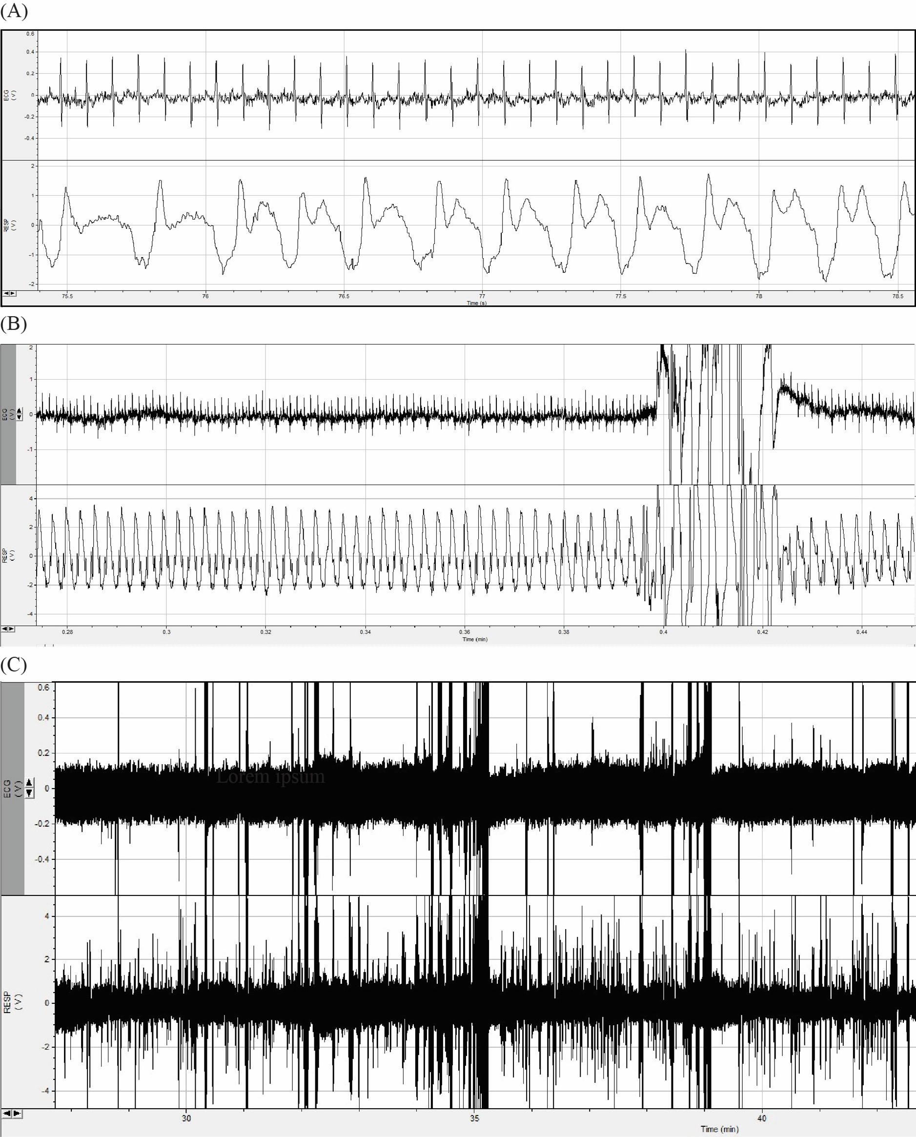a. Confirm visibility of clear ECG peaks and respiration waveforms.