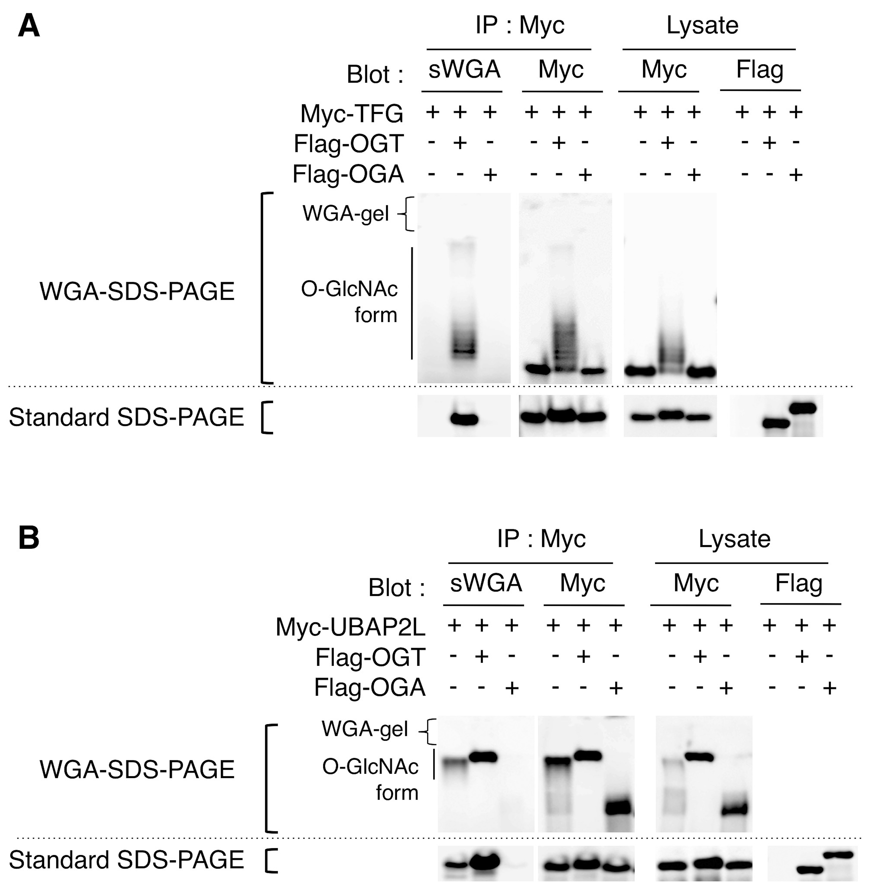 Figure 3. Detection and separation of epitope-tagged O-GlcNAcylated proteins. Myc-TFG (A) or Myc-UBAP2L (B) was transiently expressed with Flag-OGT or Flag-OGA in HEK293 cells and was immuno-purified with an anti-Myc antibody. After separation of the purified proteins by WGA-SDS-PAGE (upper panel) or standard SDS-PAGE (lower panel), the proteins were transferred to nitrocellulose membranes and immunoblotted with the indicated antibodies or probed for their O-GlcNAcylation using succinylated WGA-HRP (sWGA). The expression of Flag-OGT and Flag-OGA in cell lysates was confirmed in the standard SDS-PAGE using an anti-Flag antibody. The images are taken from Kubota et al. (2017).