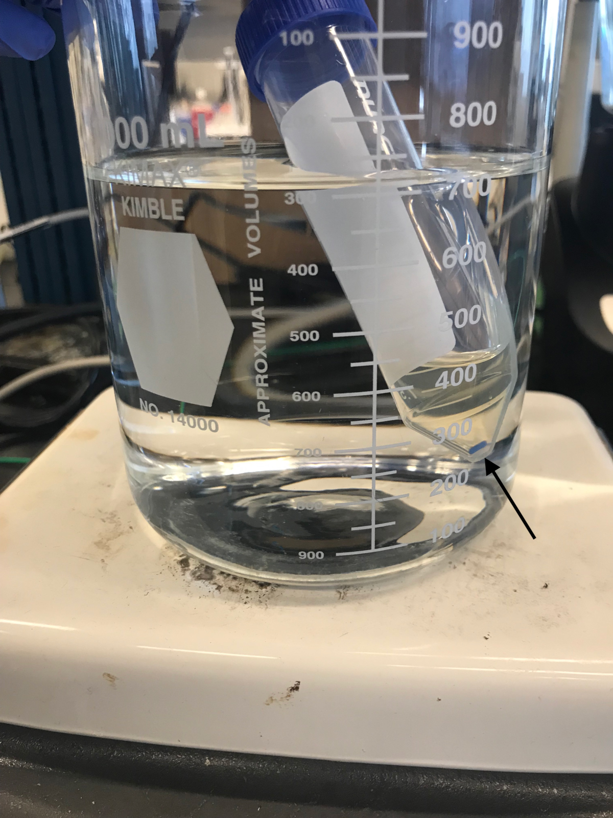 Figure 1. Cell lysis. Cells in 4% SDS are boiled with stirring for 3 h. The arrow indicates the micro stir bar.
