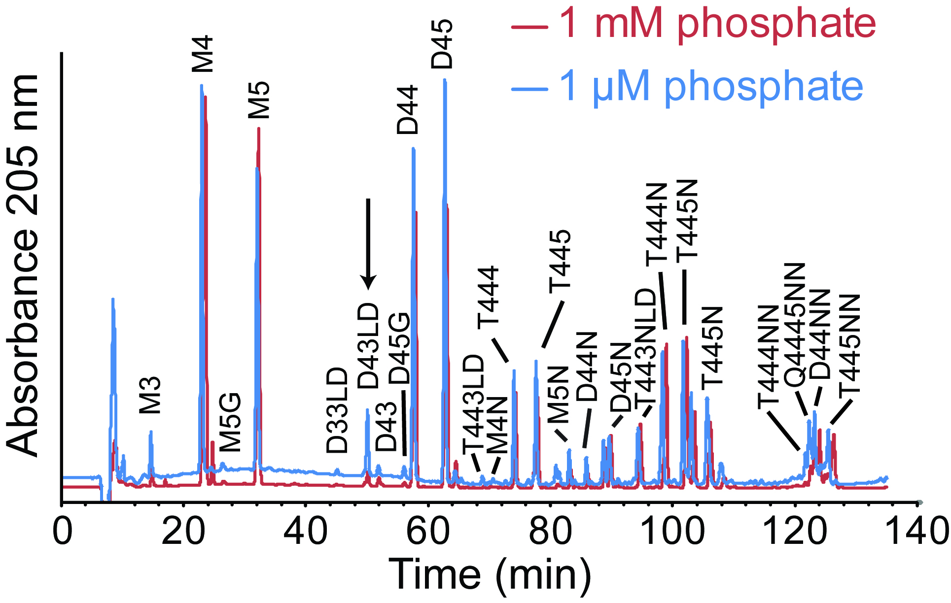 Figure 5. Muropeptide analysis of C. crescentus grown in different phosphate concentrations. Muropeptides were purified from Caulobacter crescentus grown in HIGG media with 1 mM or 1 µM phosphate and analyzed via HPLC. The arrow indicates a peak uniquely present in the 1 µM phosphate chromatogram. Major peaks were labeled based on previous analysis of C. crescentus muropeptides (Takacs et al., 2010). LD-crosslinks were labeled based on previous analysis of E. coli muropeptides (Glauner, 1988) and confirmed by LC/MS. This figure is reprinted with permission from John Wiley and Sons (Stankeviciute et al., 2019).