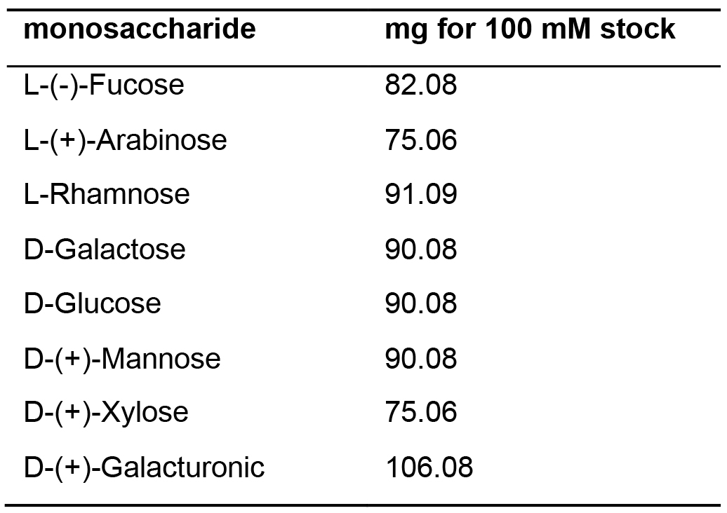 - To prepare a 100 mM monosaccharide stock solution containing 100 mM each of L-(-)-Fucose, L-(+)-Arabinose, L-Rhamnose, D-Galactose, D-Glucose, D-(+)-Mannose, D-(+)-Xylose, D-(+)-Galacturonic acid, weigh the appropriate amount of each sugar in Table 2 below