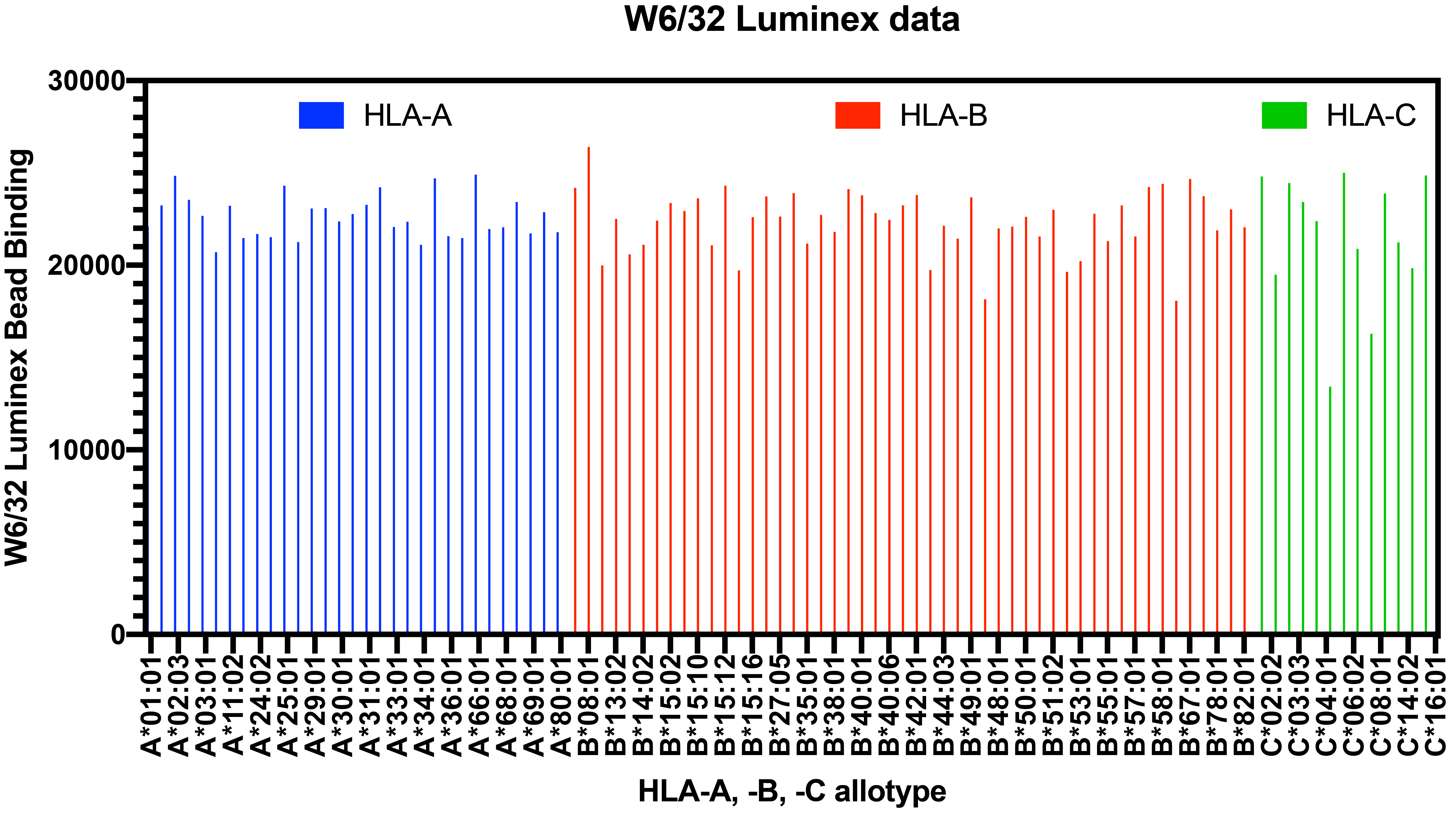 Figure 2. Labscreen Single Antigen Immunoaffinity sample data. Representative data are shown for W6/32 (a pan anti-HLA class-I antibody [Barnstable et al., 1978 and Raghavan et al., 2019]) binding to the indicated HLA-I beads.