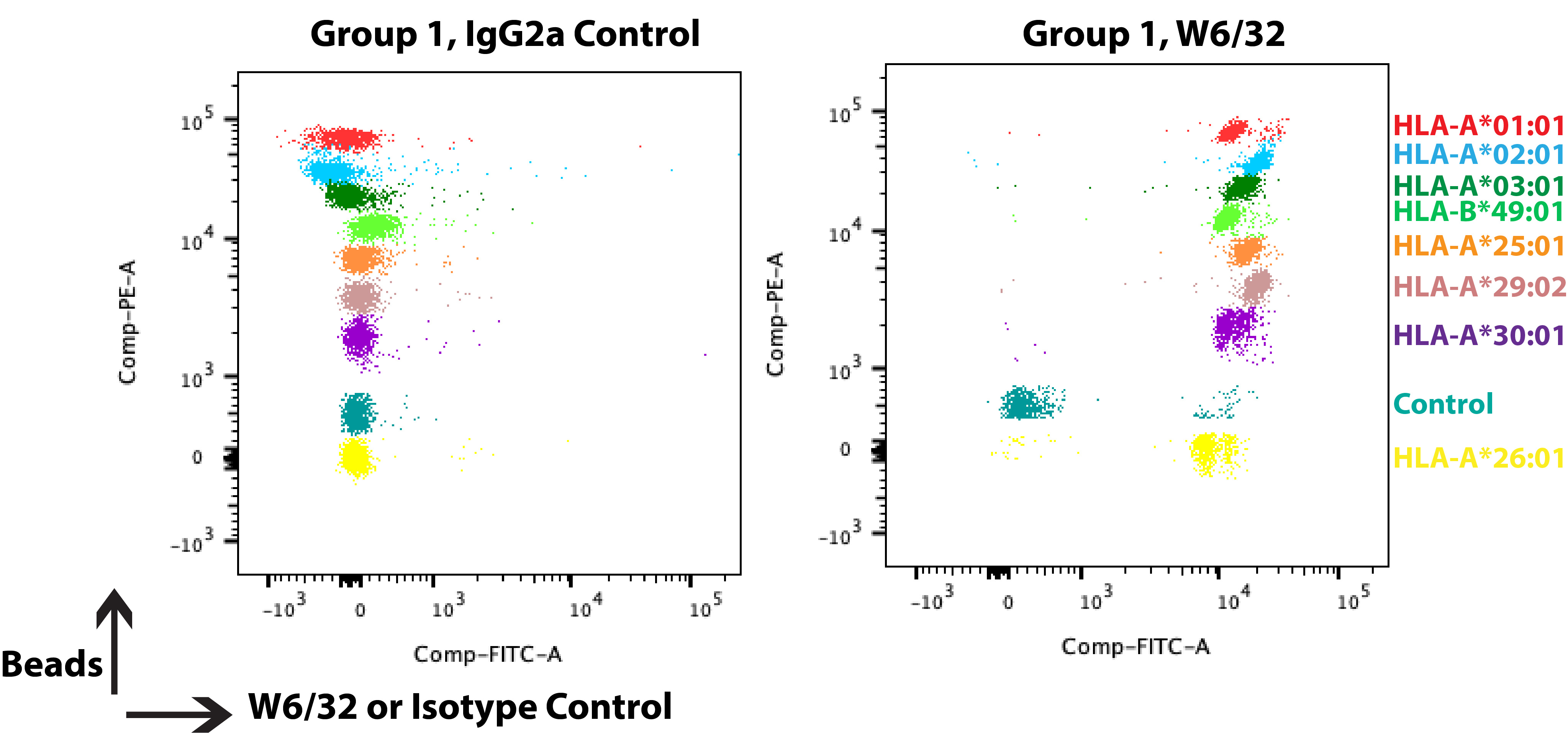Figure 3. FlowPRA Single Antigen Beads sample data. FlowPRA single antigen beads come as four groups, each containing 8 HLA-I beads and one negative control bead (without HLA-I labeled 8, and colored teal in dot plots) that are individually identifiable in the PE channel. The beads are successively incubated and washed: biotinylated antibody, buffer, streptavidin-FITC, buffer. They are then measured on a flow cytometer. The dot plots are from a representative experiment, where isotype control, IgG2a (left panel), or W6/32 (right panel) were incubated with Group 1 of FlowPRA single antigen beads.