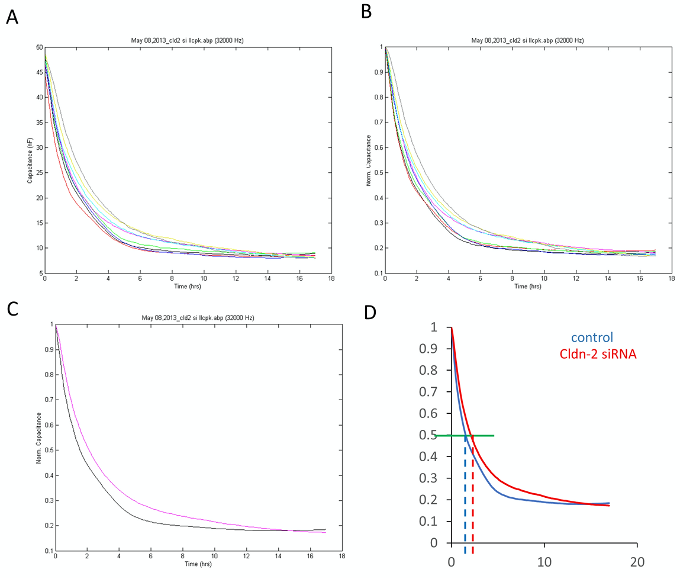 Figure 3. Data exported using the ECIS software with or without various processing. A-C. Exported graphs with various steps of analysis, as described in the protocol. A. All data are shown (graph from Figure 1). B. Data were normalized to the first point of the measurement. C. Data grouped according to the conditions. Black: NR siRNA; pink: Claudin-2 siRNA. D. Determination of half revovery time. Data were exported to Excel and graphed using a scatter graph with line option. Blue: NR siRNA; red: Claudin-2 siRNA. The green horizontal line indicates 0.5 C value (Y axis), and the blue and red dashed lines indicate the corresponding time (X axis value).