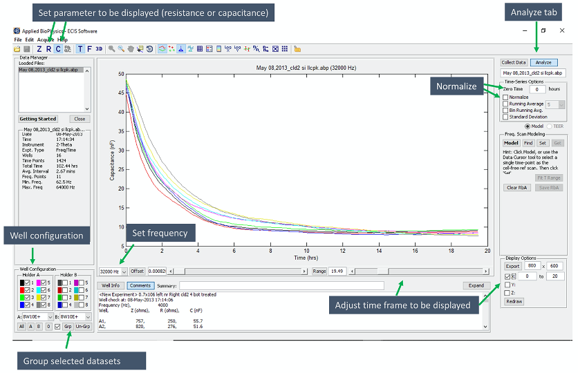In the ECIS software on the right top click the “Analyze” tab. Figure 2 shows a screenshot of the software with a typical measurement, with the corresponding commands labelled. You can select the parameters and curves you want to export. This limits the amount of data exported. Alternatively, you can export all data (see below) and process them in the graph software. However, selecting the data needed for your analysis prior exporting makes managing the dataset easier.