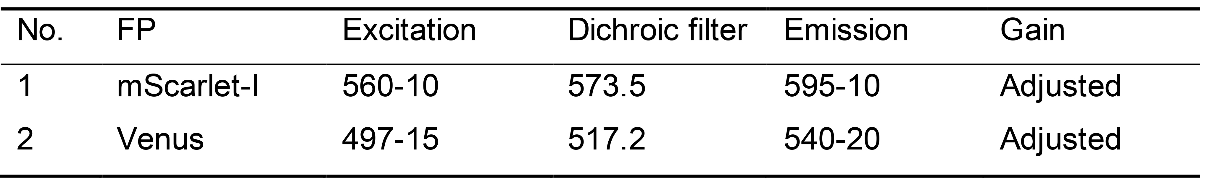 We suggest using the following optimized settings on the CLARIOstar plate reader to measure mScarlet-I and Venus fluorescence.