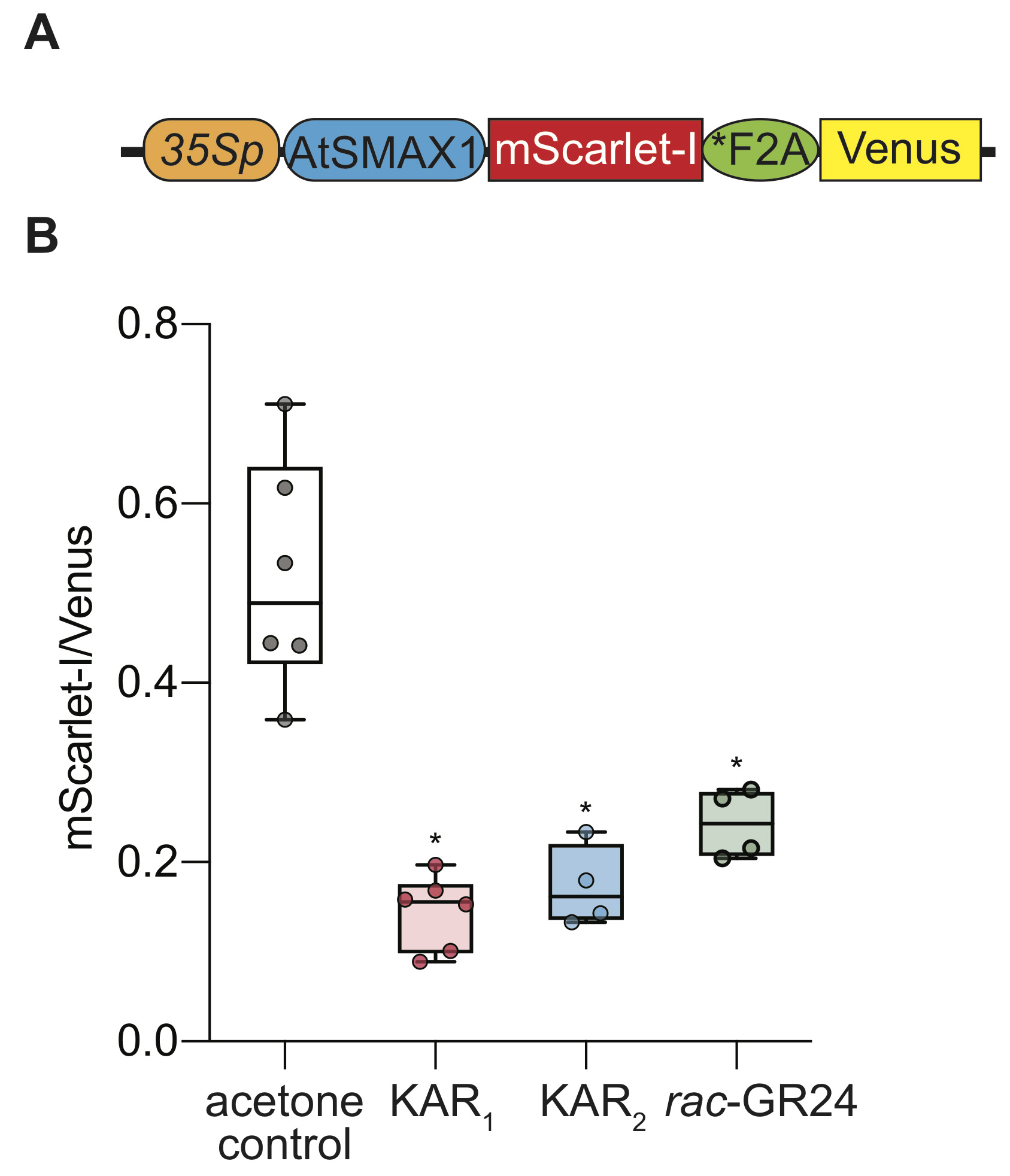 Figure 2. Ratiometric detection of SMAX1 degradation in tobacco. A. Diagram of the pRATIO3212-SMAX1 ratiometric reporter system. The 35S promoter drives expression of a multicistronic transcript encoding an SMAX1-mScarlet-I fusion that is separately translated from the Venus fluorescent protein due to the *F2A peptide. B. Relative fluorescence of SMAX1 in the pRATIO3212 system after transient expression in tobacco and overnight treatment with 10 μM KAR1, KAR2, rac-GR24, or 0.02% (v/v) acetone control. n = 5-6 leaf discs. *P < 0.01, Mann-Whitney U test comparisons to control treatment. The data shown is representative of one leaf out of three independent leaves with similar results.