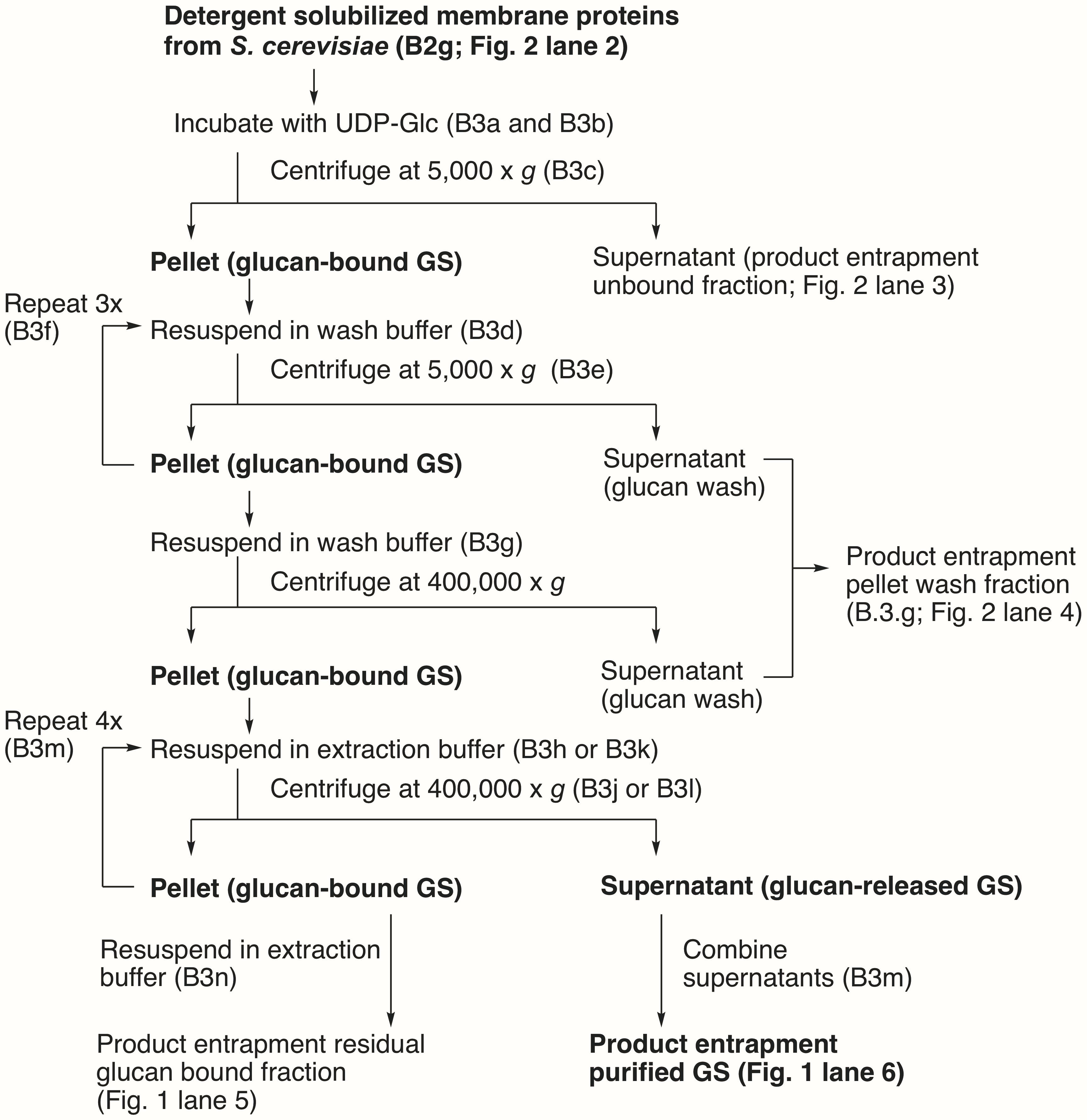 Here, we report the protocol used for the determination of the amount and length of (1,3)-β-d-glucan using SEC in aqueous sodium hydroxide with pulsed amperometric detection (PAD) and radioactivity counting (RC). This protocol overcomes the aforementioned limitations: PAD and RC allow the characterization of the length and distribution of glucan polymers at sensitivities appropriate for the mechanistic characterization of GS, and the use of aqueous sodium hydroxide as a solvent allows solubilization of the otherwise water-insoluble (1,3)-β-d-glucan. The detection limit of this approach (~100 pmol) is greater than four orders of magnitude lower than reducing end modification previously reported for (1,3)-β-d-glucan characterization. One important limitation of this assay is that it requires reasonably pure GS. So far, the method does not work with crude membrane fractions due to the presence of proteins that perturb the migration of glucan through the SEC column. Therefore, in this protocol, we describe both the preparation of partially purified GS using the product entrapment method and the SEC assay. The product entrapment yields GS with 20–30% purity on SDS-PAGE and a specific activity of ~1,000 nmol/min/mg. While our characterization suggests that the impurities in this preparation does not affect the apparent function of GS (either glucan length or kinetics) (Chhetri et al., 2020), it is critical to remove proteins from the glucan samples by washing with SDS. This protocol has been used to study the mechanism of GS catalysis and successfully detected (1,3)-β-d-glucan elongation between ~1,000 and ~8,000 mer for the first time in the over 40-year-long history of GS (Chhetri et al., 2020). The facile chain length determination was also coupled to blocked substrate analogs to unambiguously determine the direction of polymerization, one of the key but challenging mechanistic questions in polysaccharide biosynthesis (Chhetri et al., 2020). These applications demonstrate the significance of the SEC-based GS activity assays. Similar approaches could be adapted to study the activities of other polysaccharide synthases such as glycogen and hyaluronan synthases.