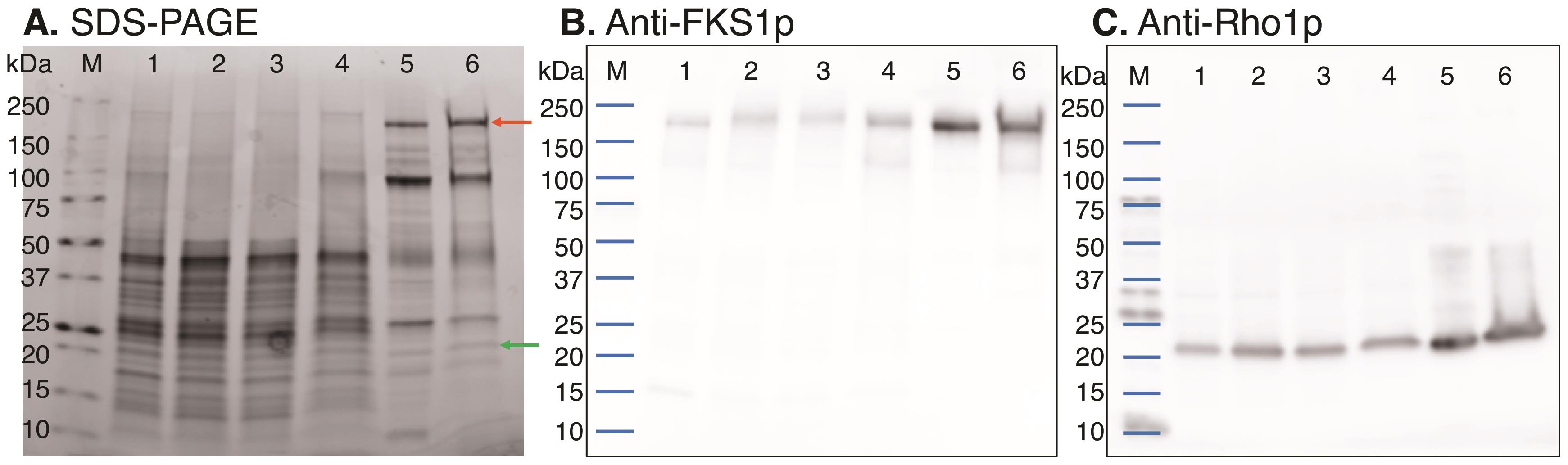 This work was funded in part by Duke University Medical Center and the National Institute of General Medical Sciences Grant R01 GM115729 (to K.Y.). A.L. was supported by the Tri-Institutional Molecular Mycology and Pathogenesis Training Program from the National Institute of Allergy and Infectious Diseases (T32AI052080). The authors thank Dr. Yoshikazu Ohya at the University of Tokyo for the anti-Rho1p antibody and Dr. Jean-Paul Latge at the Institut Pasteur for the anti-Fks1p antibody.