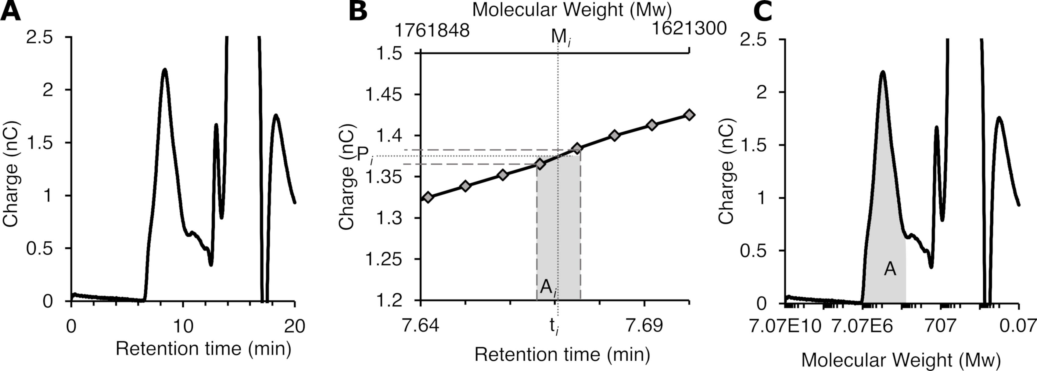 Figure 5. Determination of glucan molecular weight parameters from an SEC-PAD chromatogram. A. Chromatogram plotted with a retention time as the x-axis. B. Magnified view of the chromatogram in A with molecular weight as the x-axis. Representative slice i is highlighted. (C) Chromatogram plotted with molecular weight as the x-axis. The peak area used for the determination of the polymer length parameters is highlighted.